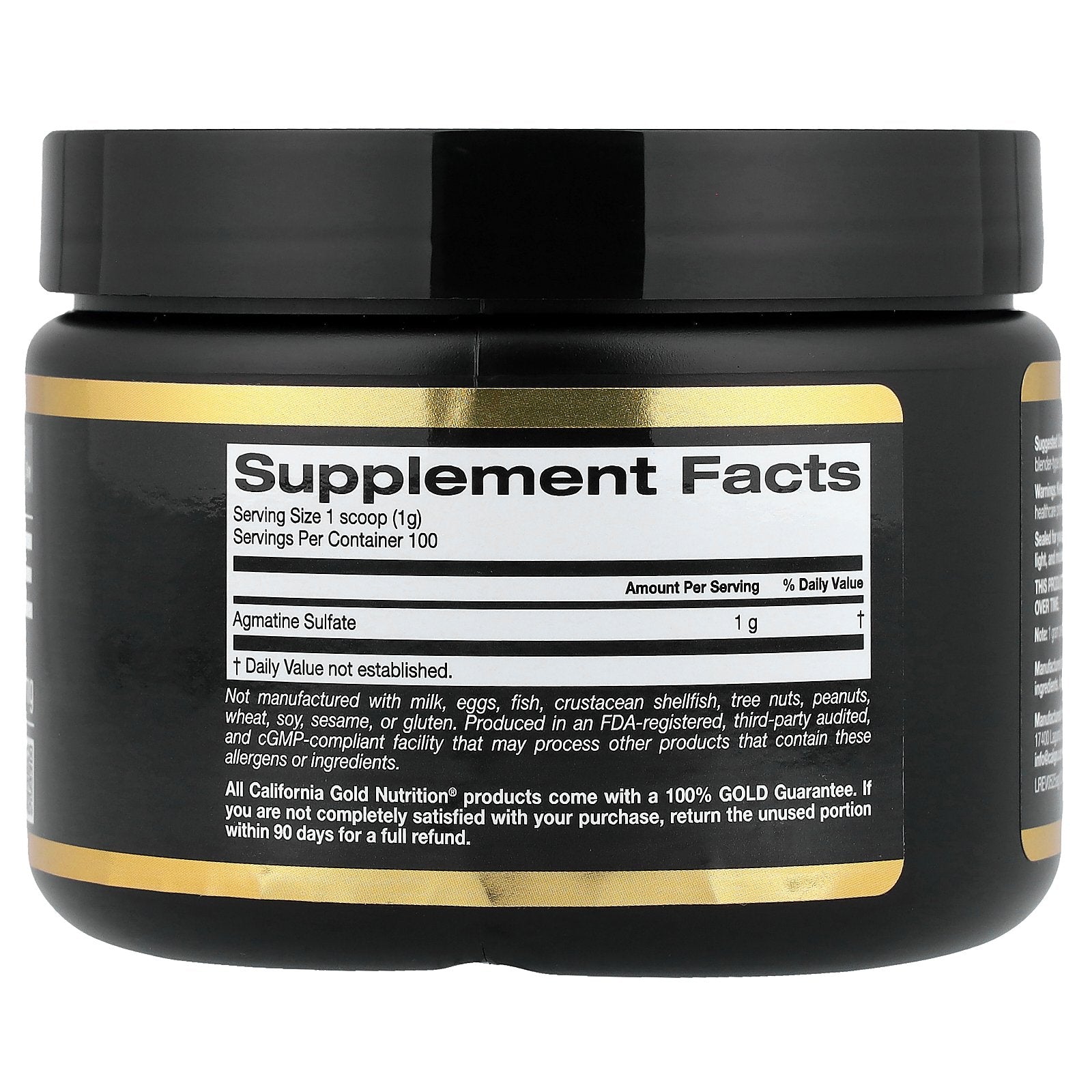 California Gold Nutrition® Agmatine Sulfate supports optimal athletic performance and enhances your wellness routine with premium Agmatine Sulfate.* Fuel your body and mind with the energizing Agmatine Sulfate, known for its benefits beyond bodybuilding.* Agmatine, a metabolite of the amino acid L-arginine, boosts nitric oxide production, improving blood flow to muscles, the brain, and other tissues.* More effective than L-arginine, Agmatine Sulfate is favored by endurance athletes and those seeking to combat fatigue and enhance recovery.* This potent 1 gram (1,000 mg) serving supports endurance, vitality, cardiovascular health, memory, and mood, making it a versatile supplement for overall wellness.*