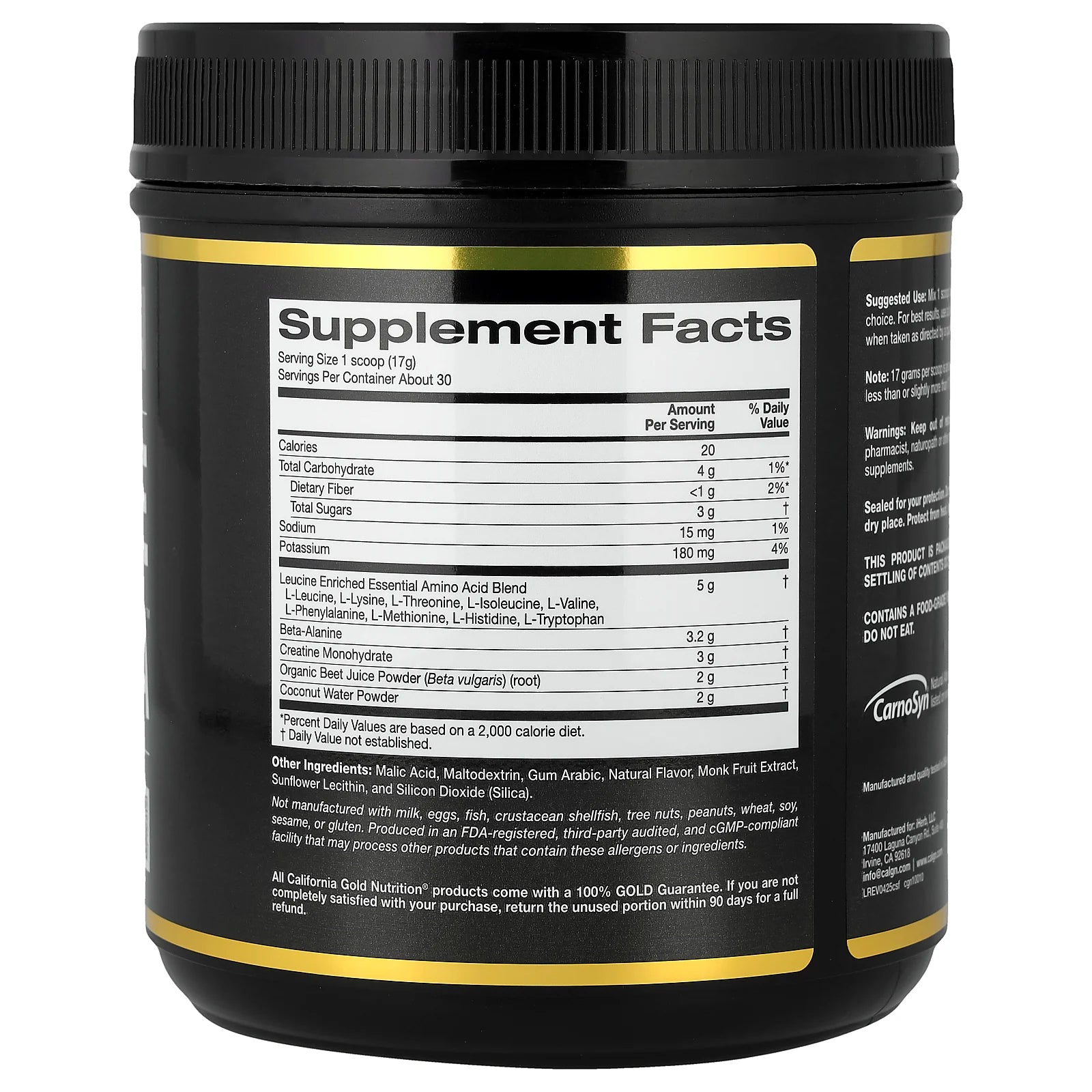 - With Leucine Enriched Essential Amino Acid Blend, Beta-Alanine, Organic Beet Juice Powder, and Coconut Water Powder