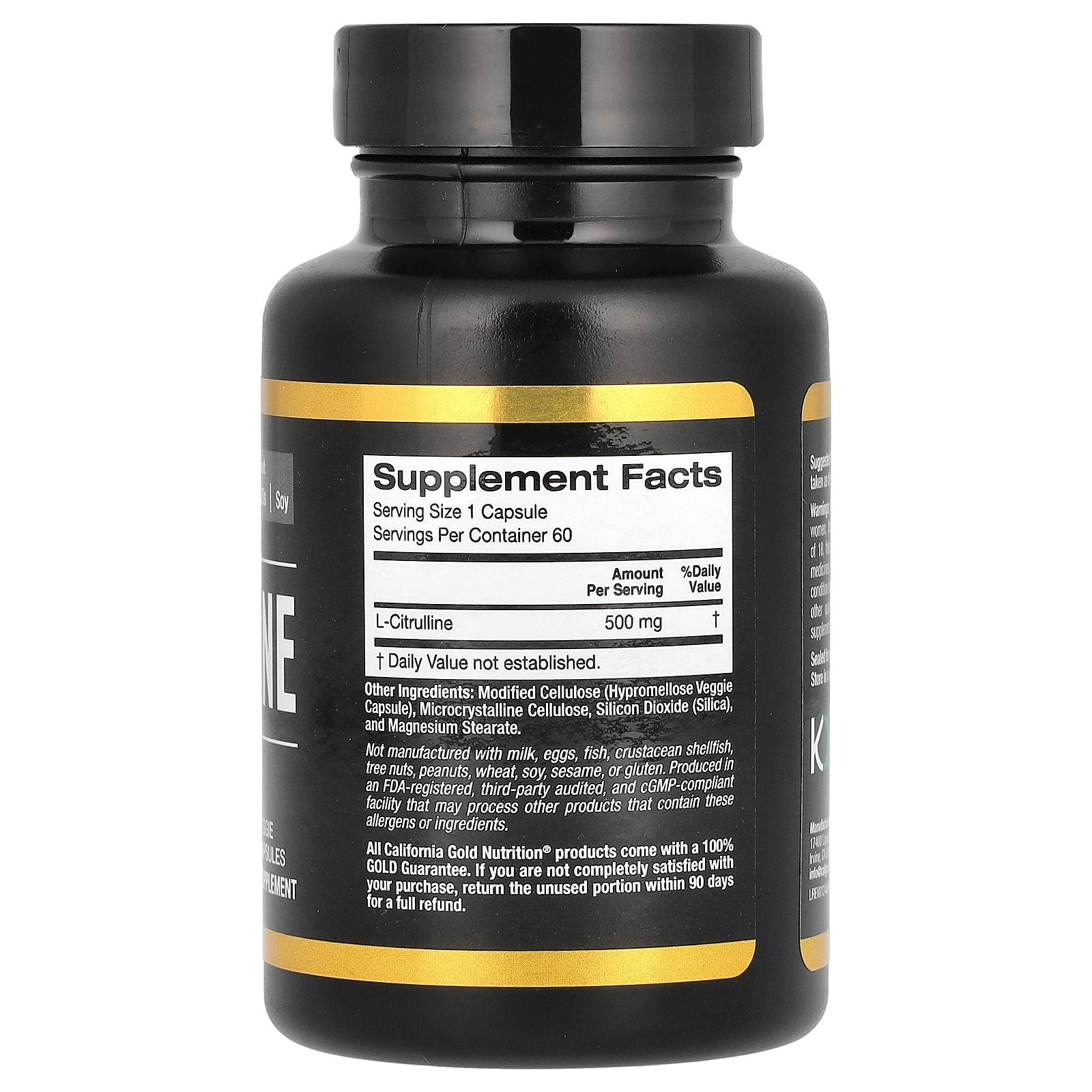 Not manufactured with milk, eggs, fish, crustacean shellfish, tree nuts, peanuts, wheat, soy, sesame, or gluten. Produced in an FDA-registered, third-party audited, and cGMP-compliant facility that may process other products that contain these allergens or ingredients.