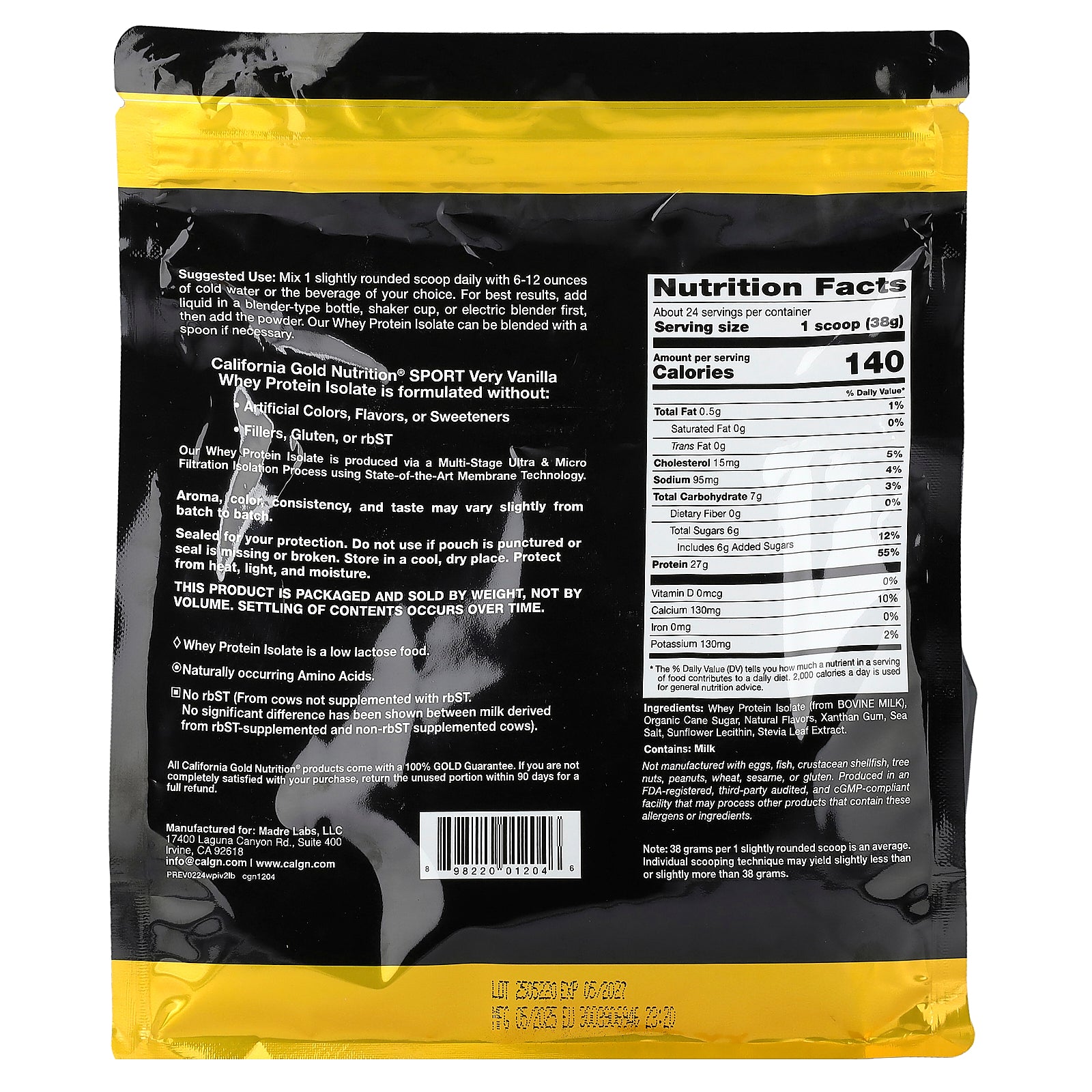 California Gold Nutrition Sport Very Vanilla Whey Protein Isolate features more than 25 grams of protein and 6 grams of BCAAs per serving. It contains low lactose and is manufactured by a multi-stage cold micro-filtration isolation process using state-of-the-art membrane technology.