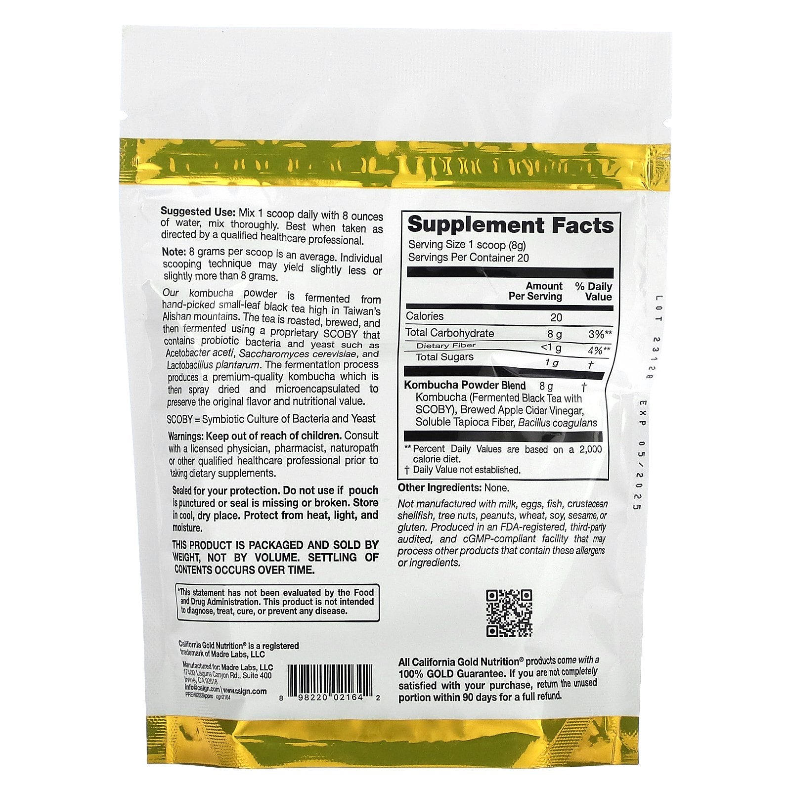 California Gold Nutrition Superfoods Kombucha Powder Plus Probiotics is made with hand-picked, small-leaf black tea from high in Taiwan’s Alishan mountains. It then undergoes our fermentation process to produce a premium-quality kombucha, which is spray dried and microencapsulated to preserve the flavor and nutritional value. Simply add the powder to water to create a beneficial kombucha drink.