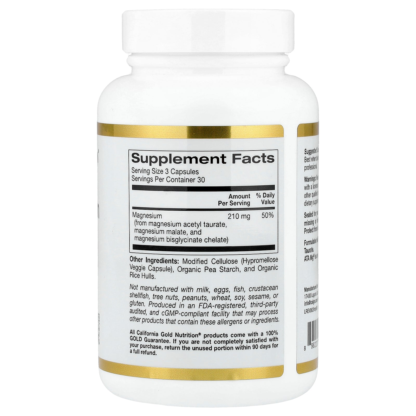 California Gold Nutrition® Triple Magnesium Complex combines three unique forms of bioavailable Magnesium (as Magnesium Acetyl Taurate,Magnesium Malate, Magnesium Bisglycinate Chelate) providing 210 mg of elemental magnesium per serving. Magnesium is an essential nutrient involved in many metabolic functions of the human body (e.g., heart health, bone health, nerve function, etc.)*