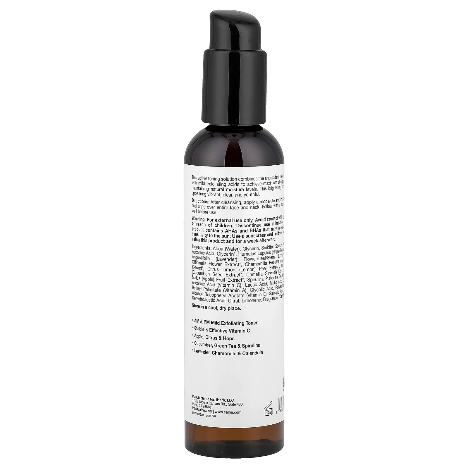 Aqua (Water), Glycerin, Sorbitol, Sodium PCA, 3-O-Ethyl Ascorbic Acid, Glycerin*, Humulus Lupulus (Hops) Extract*, Lavandula Angustifolia (Lavender) Flower/Leaf/Stem Extract*, Calendula Officinalis Flower Extract*, Chamomilla Recutita (Matricaria) Flower Extract*, Citrus Limon (Lemon) Peel Extract*, Cucumis Sativus (Cucumber) Seed Extract*, Camellia Sinensis Leaf Extract*, Pyrus Malus (Apple) Fruit Extract*, Spirulina Platensis Extract*, Citric Acid, Ascorbic Acid (Vitamin C), Lactic Acid, Malic Acid, Gluconic Acid, Retinyl Palmitate (Vitamin A), Glycolic Acid, Polysorbate 20, Benzyl Alcohol, Tocopheryl Acetate (Vitamin E), Salicylic Acid, Tartaric Acid, Dehydroacetic Acid, Citral, Limonene, Fragrance.