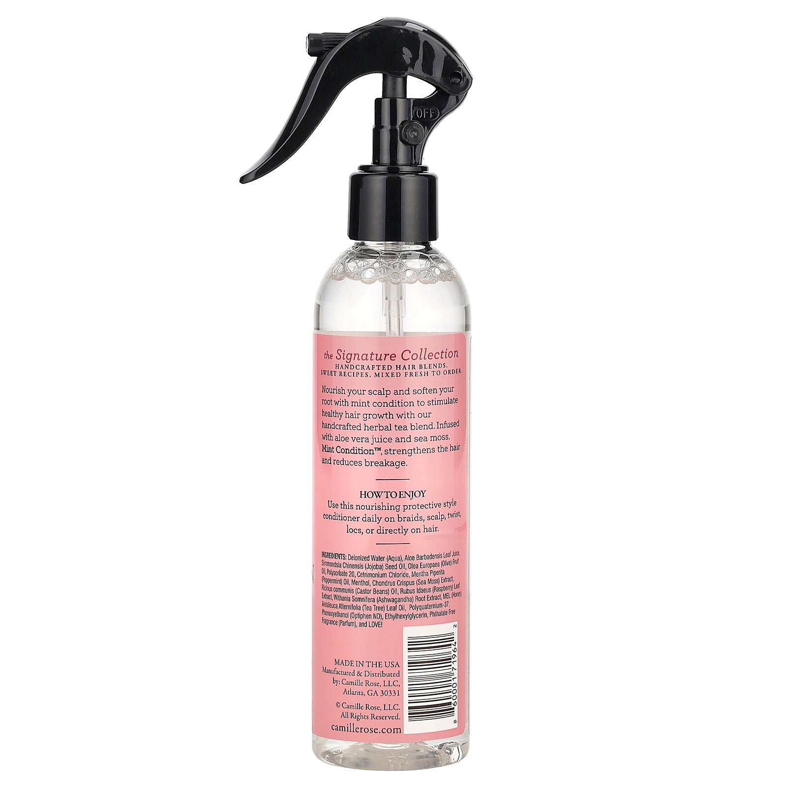 Deionized water (aqua), aloe barbadensis leaf juice, simmondsia chinensis (jojoba) seed oil, olea europaea (olive) fruit oil, polysorbate 20, cetrimonium chloride, mentha piperita peppermint) oil, menthol, chondrus crispus (sea moss) extract, ricinus communis (castor beans) oil, rubus idaeus (raspberry) leaf extract, withania somnifera (ashwagandha) root extract, mel (honey), melaleuca alternifolia (tea tree) leaf oil, polyquaternium-37, phenoxyethanol (optiphen nd), ethylhexylglycerin, phthalate free fragrance (parfum), and love!