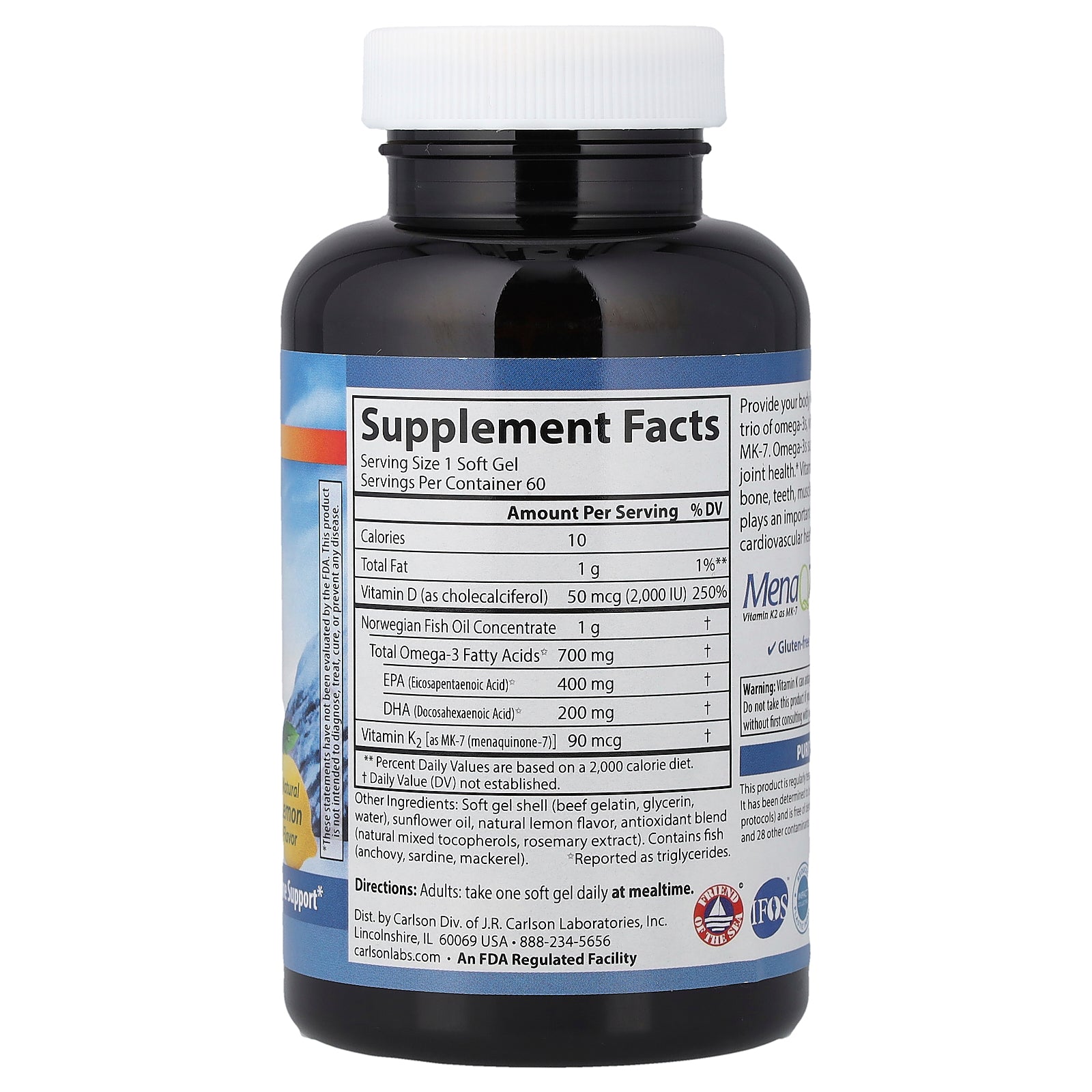 Provide your body with the powerful nutrient trio of omega-3s, vitamin D3, and vitamin K2 as MK-7. The beneficial omega-3s EPA and DHA support heart, brain, vision, and joint health. Vitamin D3 is critical for maintaining bone, teeth, muscle, and immune health. MK-7 is the most bioactive vitamin K form and plays an important role in promoting bone and cardiovascular health.