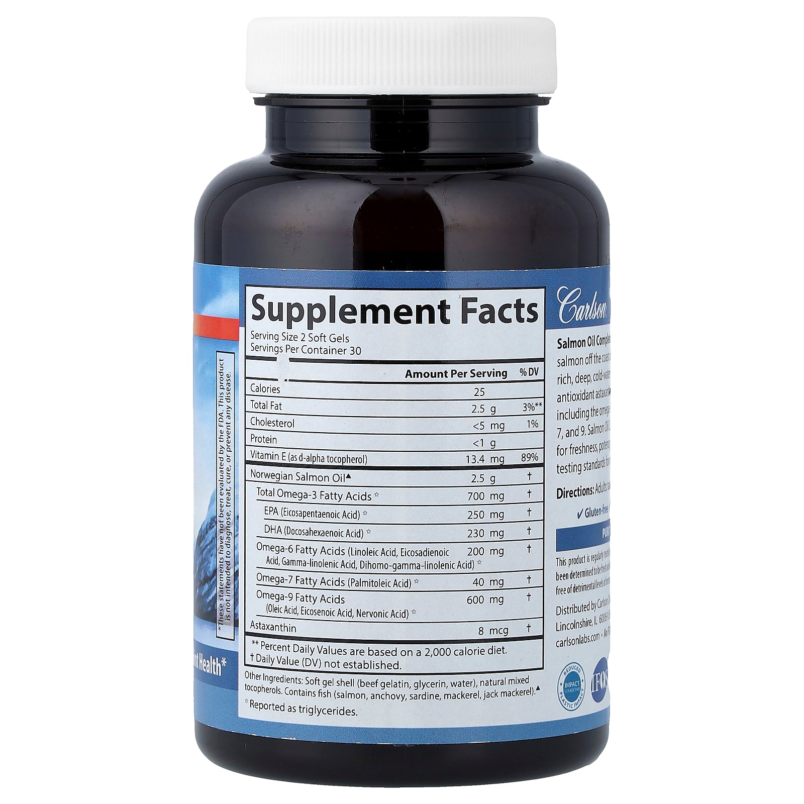 Salmon Oil Complete is sustainably sourced from salmon off the coast of Norway and other omega-3 rich, deep, cold-water fish. It provides the powerful antioxidant astaxanthin, plus 15 beneficial fatty acids, including the omega-3s EPA and DHA, and omega-6, 7, and 9. Salmon Oil Complete is third-party certified for freshness, potency, and purity; and exceeds strict testing standards for mercury and other contaminants.