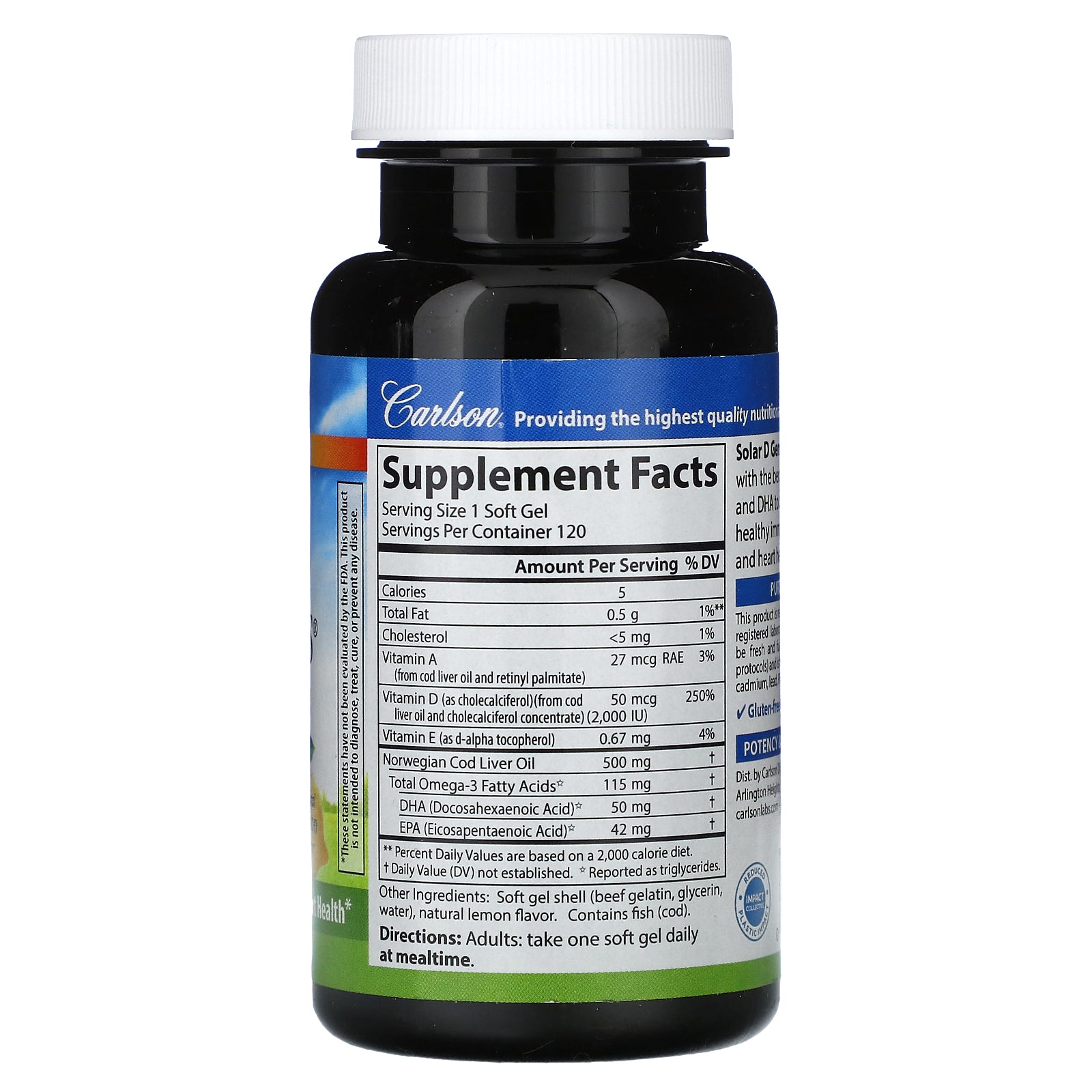 Carlson, Solar D Gems® , Vitamin D3 + Omega-3s, Natural Lemon, 120 Soft Gels
