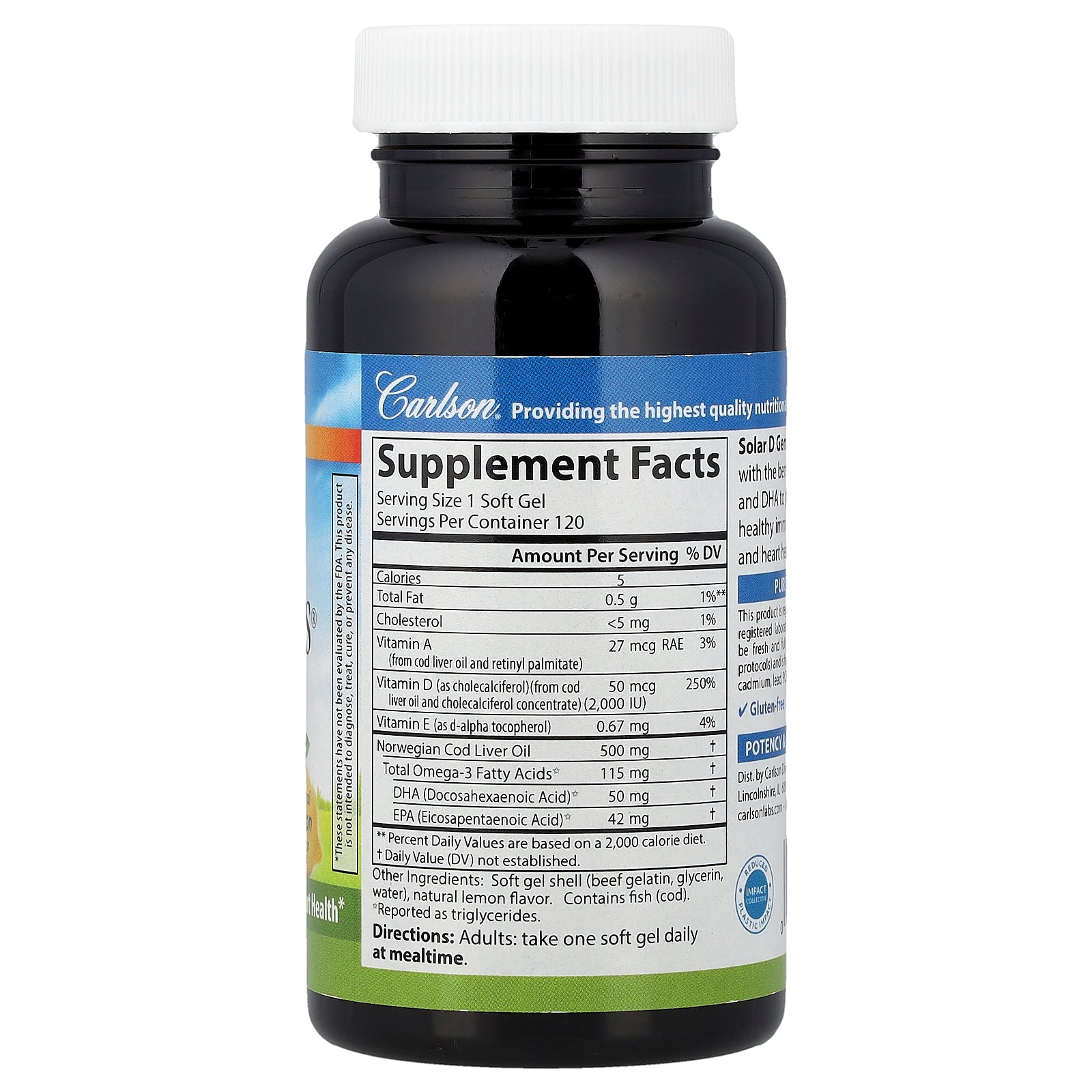 Carlson, Solar D Gems®, Vitamin D3 + Omega-3s, Natural Lemon, 120 Soft Gels