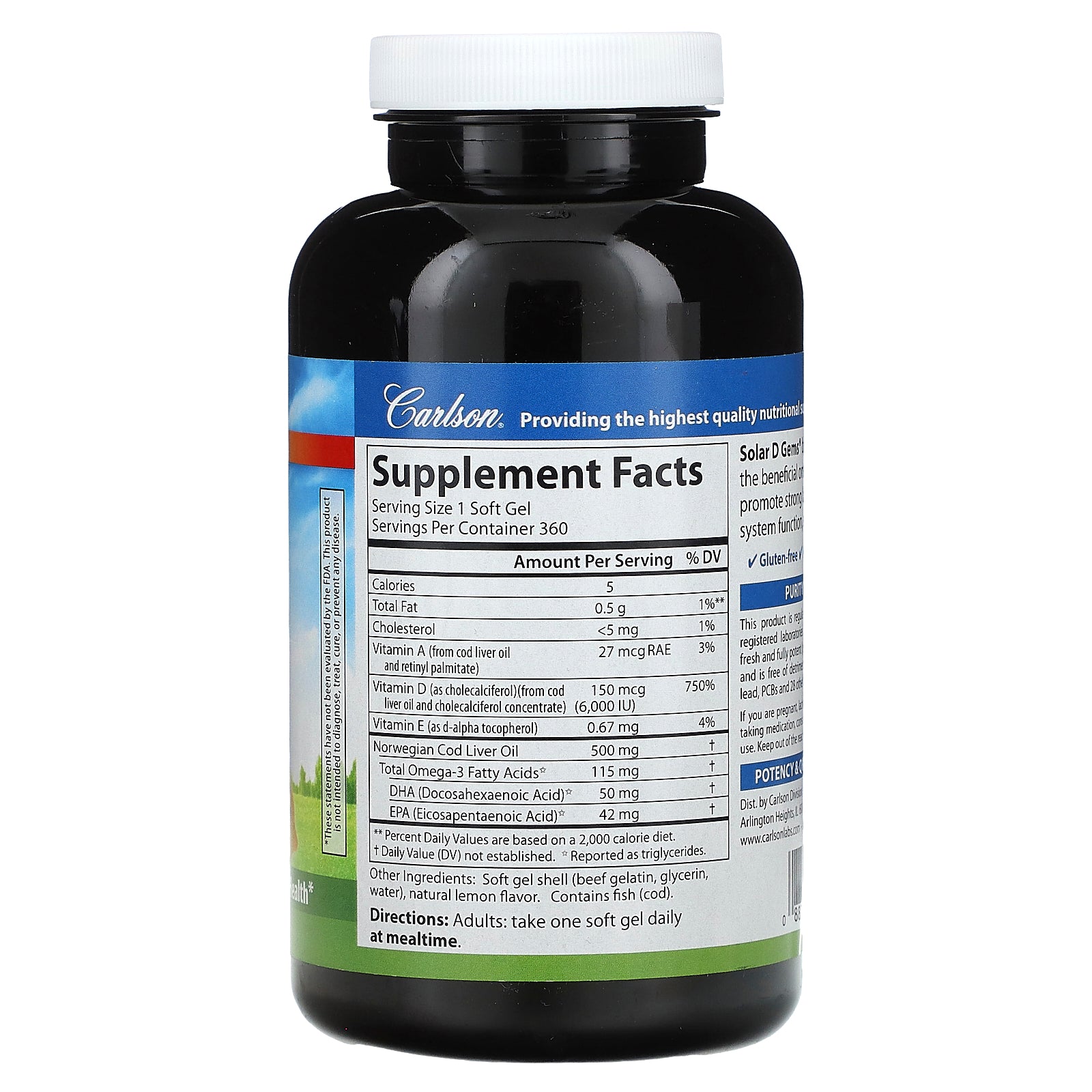 Carlson, Solar D Gems® , Vitamin D3 + Omega-3s, Natural Lemon, 360 Soft Gels