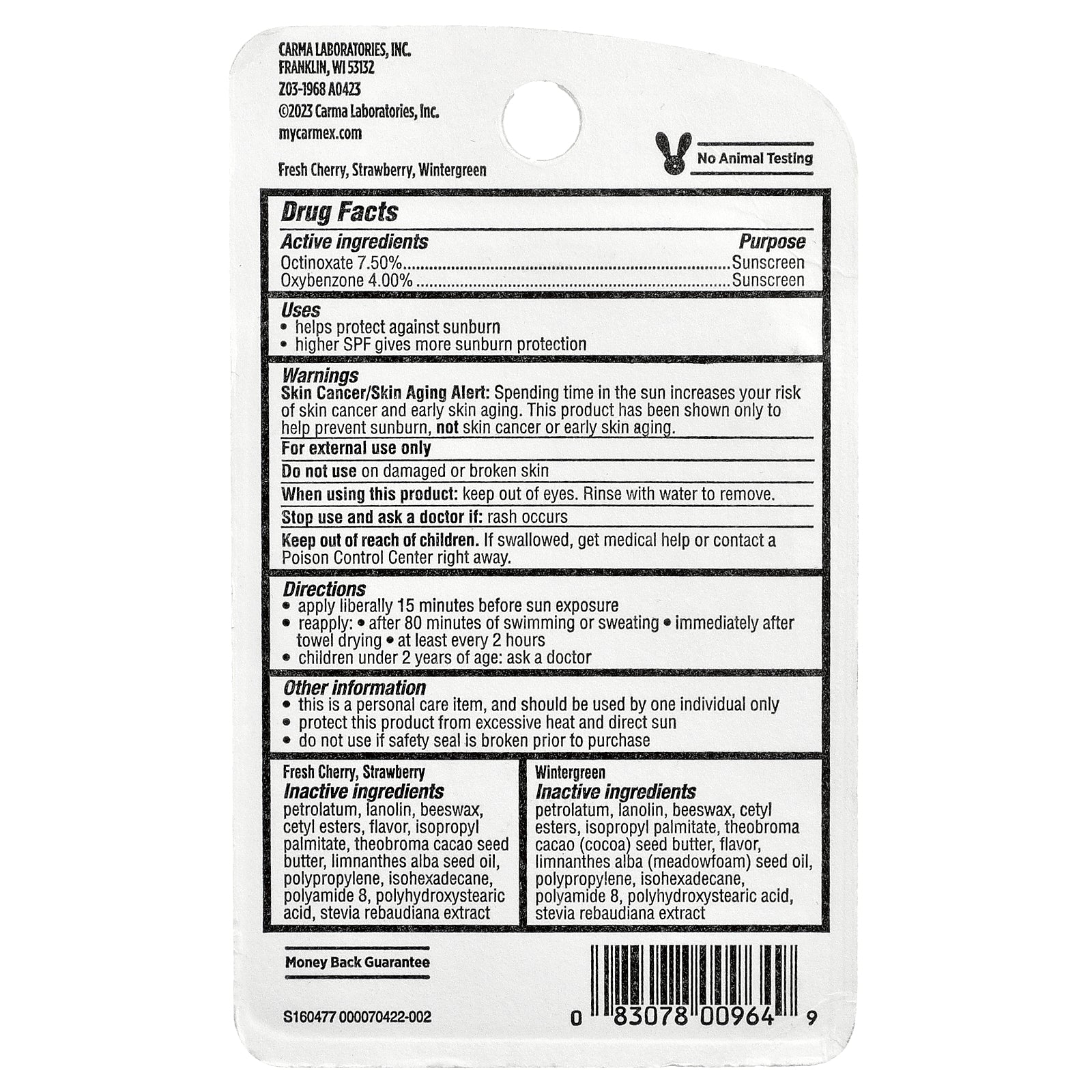 Inactive Ingredients (Fresh Cherry, Strawberry): Petrolatum, lanolin, beeswax, cetyl esters, flavor, isopropyl palmitate, theobroma cacao seed butter, limnanthes alba seed oil, polypropylene, isohexadecane, polyamide 8, polyhydroxystearic acid, stevia rebaudiana extract. Inactive Ingredients (Wintergreen): Petrolatum, lanolin, beeswax, cetyl esters, isopropyl palmitate, theobroma cacao (cocoa) seed butter, flavor, limnanthes alba (meadowfoam) seed oil, polypropylene, isohexadecane, polyamide 8, polyhydroxystearic acid, stevia rebaudiana extract. |