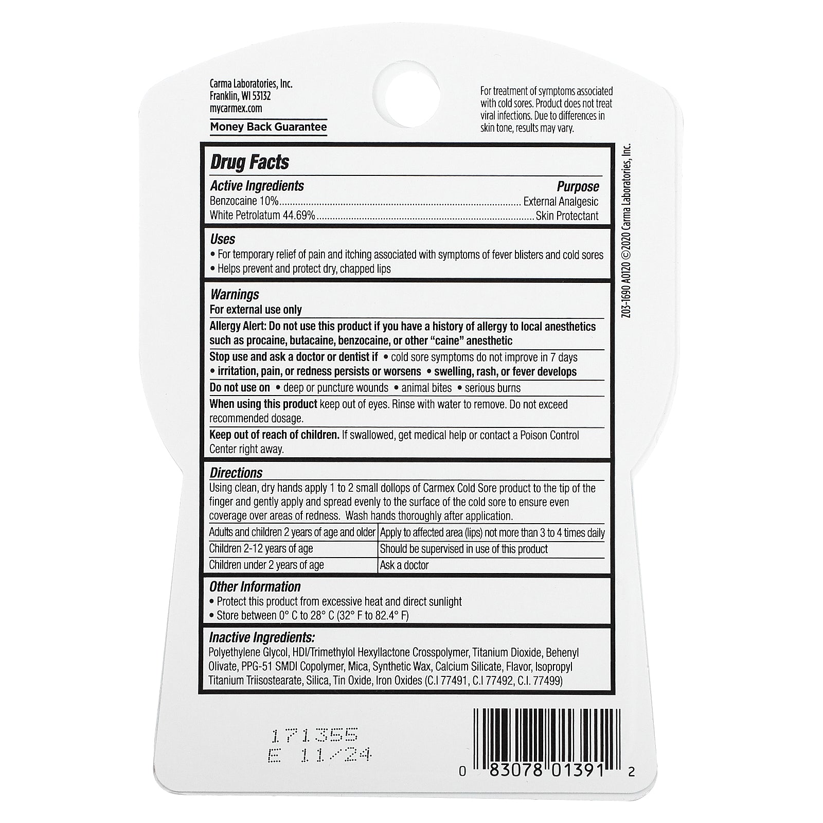 Using clean, dry hands apply 1 to 2 small drops of Carmex Cold Sore product to the tip of the finer and gently apply and spread evenly to the surface of the cold sore to ensure even coverage over areas of redness. Wash hands thoroughly after application.