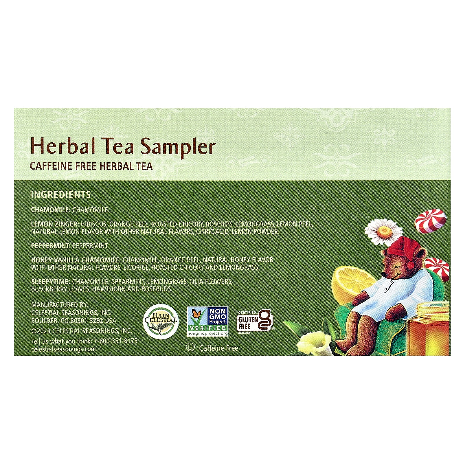 Our Herbal Tea Sampler Pack contains five favorites in one box. Wake up with tangy Lemon Zinger®, find afternoon comfort in Chamomile or Peppermint, and wind down with soothing Sleepytime® tea. Find rejuvenation and calm when you need them most.