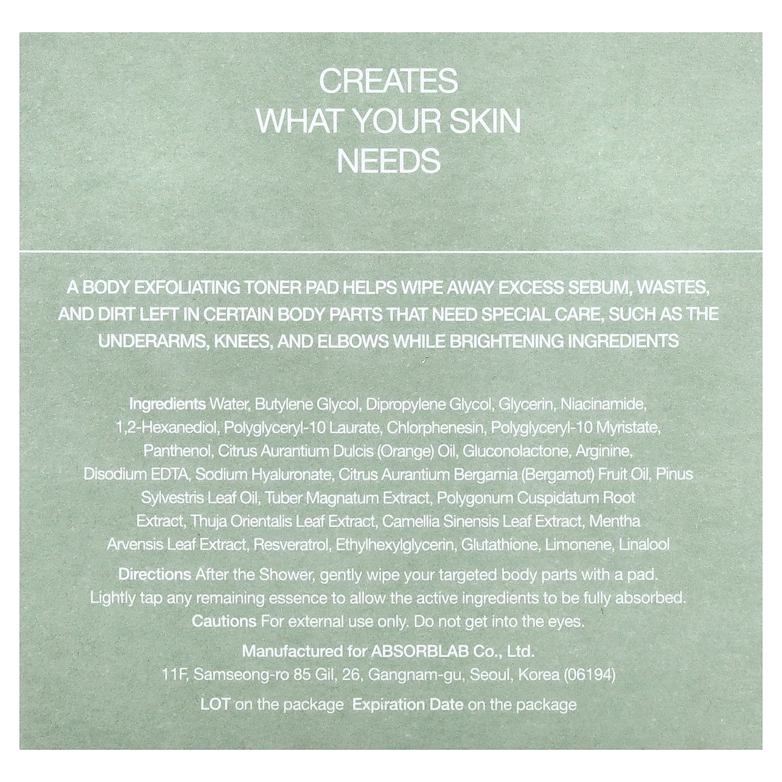 A body exfoliating toner pad helps wipe away excess sebum, wastes, and dirt left in certain body parts that need special care, such as the underarms, knees, and elbows while brightening ingredients prevent discoloration of the skin.