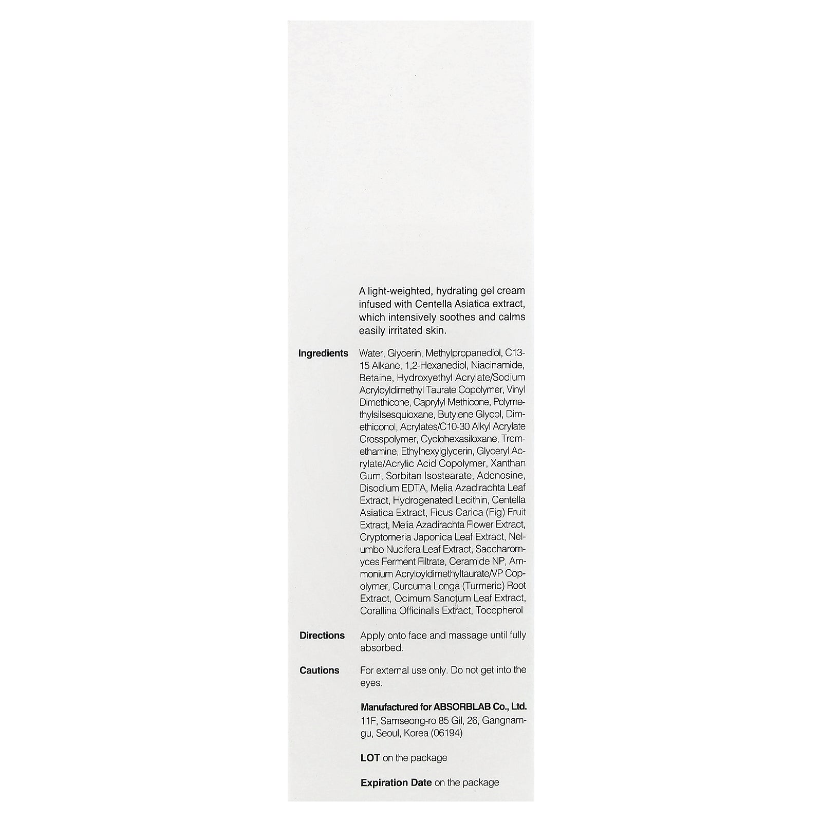 A light-weighted, hydrating gel cream infused with Centella Asiatica extract, which intensively soothes and calms easily irritated skin.