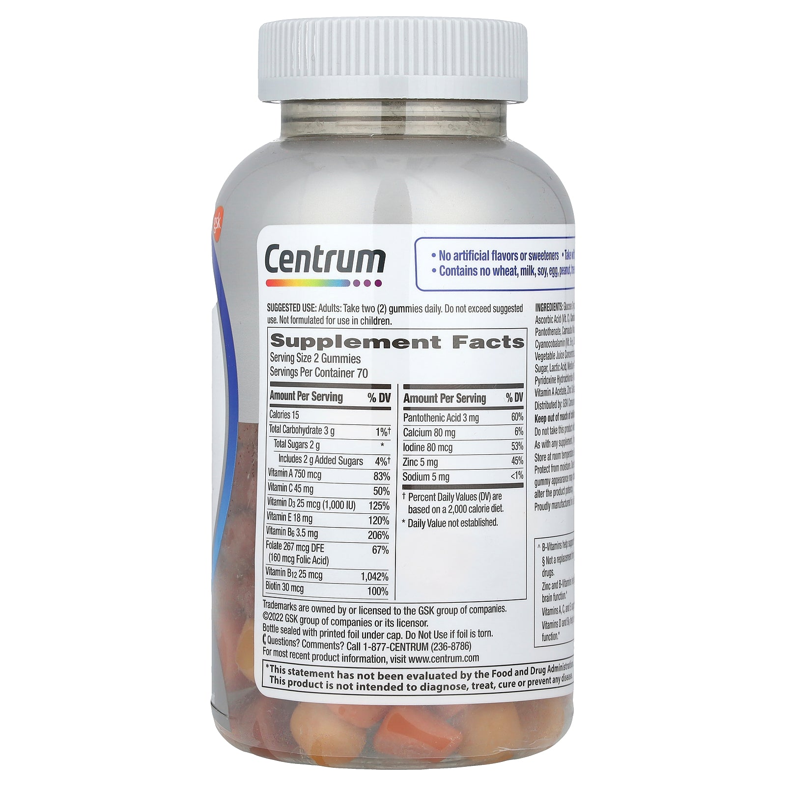 Glucose syrup, sugar, water, gelatin, tribasic calcium phosphate, ascorbic acid (vit.c), annatto seed extract (color), biotin, calcium pantothenate, carnauba wax, cholecalciferol (vit. d3), citric acid, citrus pectin, cyanocobalamin (vit. b12), dl-Alpha tocopheryl acetate (vit. e), folic acid, fruit and/or vegetable juice concentrates (purple carrot, maqui berry) (color and/or flavor), invert sugar, lactic acid, medium-chain triglycerides, natural flavors, potassium iodide, pyridoxine hydrochloride (vit. b6), sodium citrate, sodium lactate, turmeric (color), vitamin a acetate, zinc sulfate.