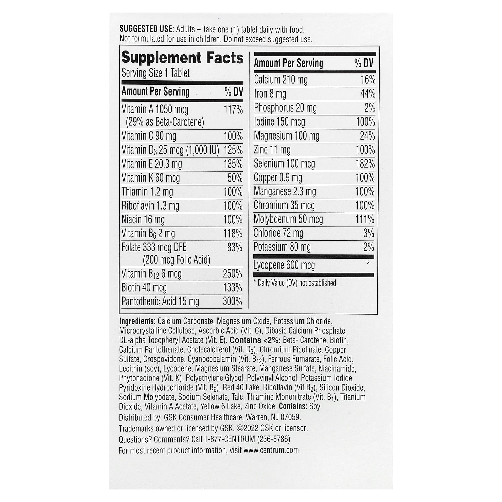 Calcium carbonate, magnesium oxide, potassium chloride, microcrystalline cellulose, ascorbic acid (vit. c), dibasic calcium phosphate, dl-alpha tocopheryl acetate (vit. e). Contains <2%: beta-carotene, biotin, calcium pantothenate, cholecalciferol (vit. d3), chromium picolinate, copper sulfate, crospovidone, cyanocobalamin (vit. b12), ferrous fumarate, folic acid, lecithin (soy), lycopene, magnesium stearate, manganese sulfate, niacinamide, phytonadione (vit. k), polyethylene glycol, polyvinyl alcohol, potassium iodide, pyridoxine hydrochloride (vit. b6), red 40 lake, riboflavin (vit b2), silicon dioxide, sodium molybdate, sodium selenate, talc, thiamine mononitrate (vit. b₁), titanium dioxide, vitamin a acetate, yellow 6 lake, zinc oxide.