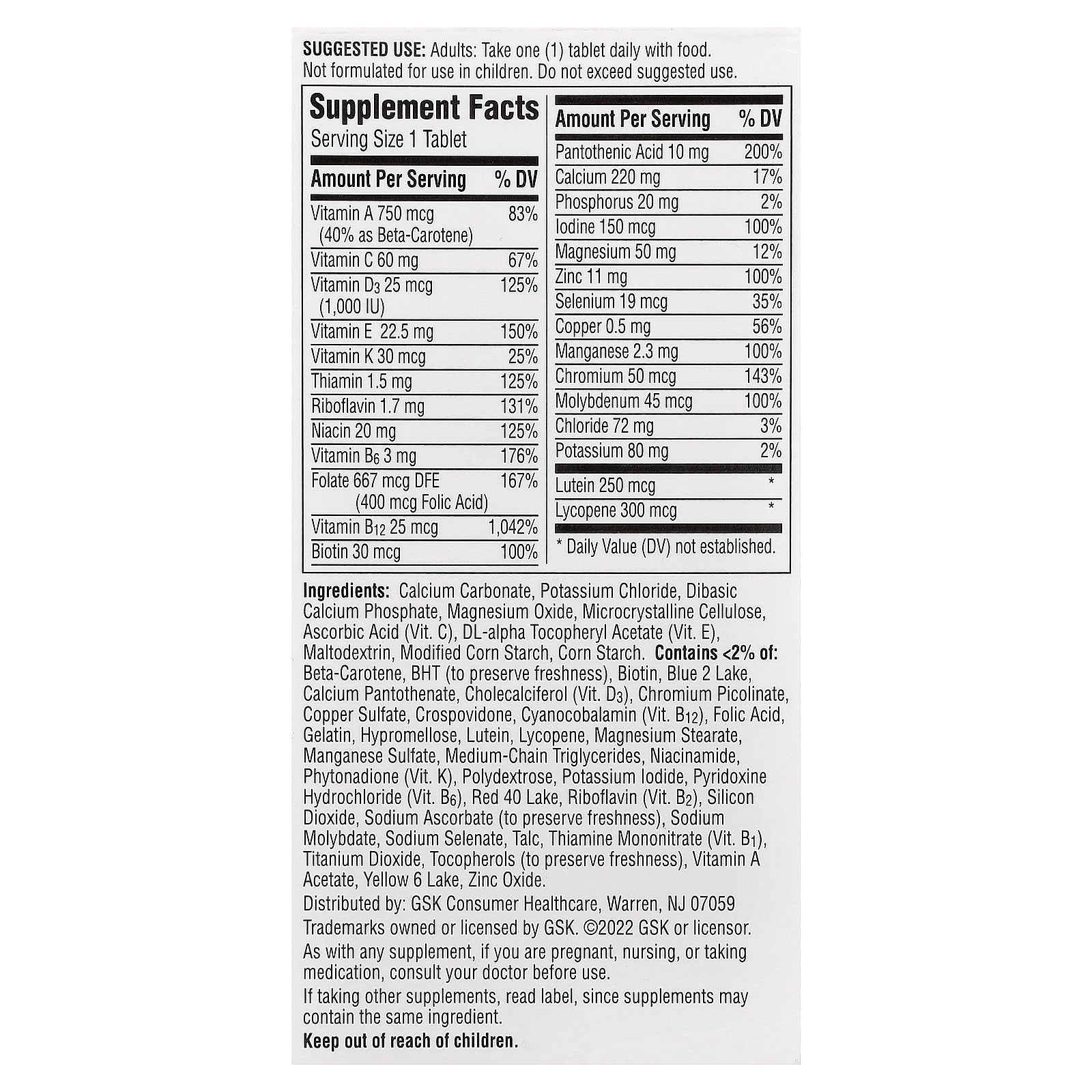 Calcium carbonate, potassium chloride, dibasic calcium phosphate, magnesium oxide, microcrystalline cellulose, ascorbic acid (vit. c), dl-alpha tocopheryl acetate (vit. e), maltodextrin, modified corn starch, corn starch. contains <2% of: beta-carotene, bht (to preserve freshness), biotin, blue 2 lake, calcium pantothenate, cholecalciferol (vit. d3), chromium picolinate, copper sulfate, crospovidone, cyanocobalamin (vit. b12), folic acid, gelatin, hypromellose, lutein, lycopene, magnesium stearate, manganese sulfate, medium-chain triglycerides, niacinamide, phytonadione (vit. k), polydextrose, potassium iodide, pyridoxine hydrochloride (vit. b6), red 40 lake, riboflavin (vit. b2), silicon dioxide, sodium ascorbate (to preserve freshness), sodium molybdate, sodium selenate, talc, thiamine mononitrate (vit. b1), titanium dioxide, tocopherols (to preserve freshness), vitamin a acetate, yellow 6 lake, zinc oxide.
