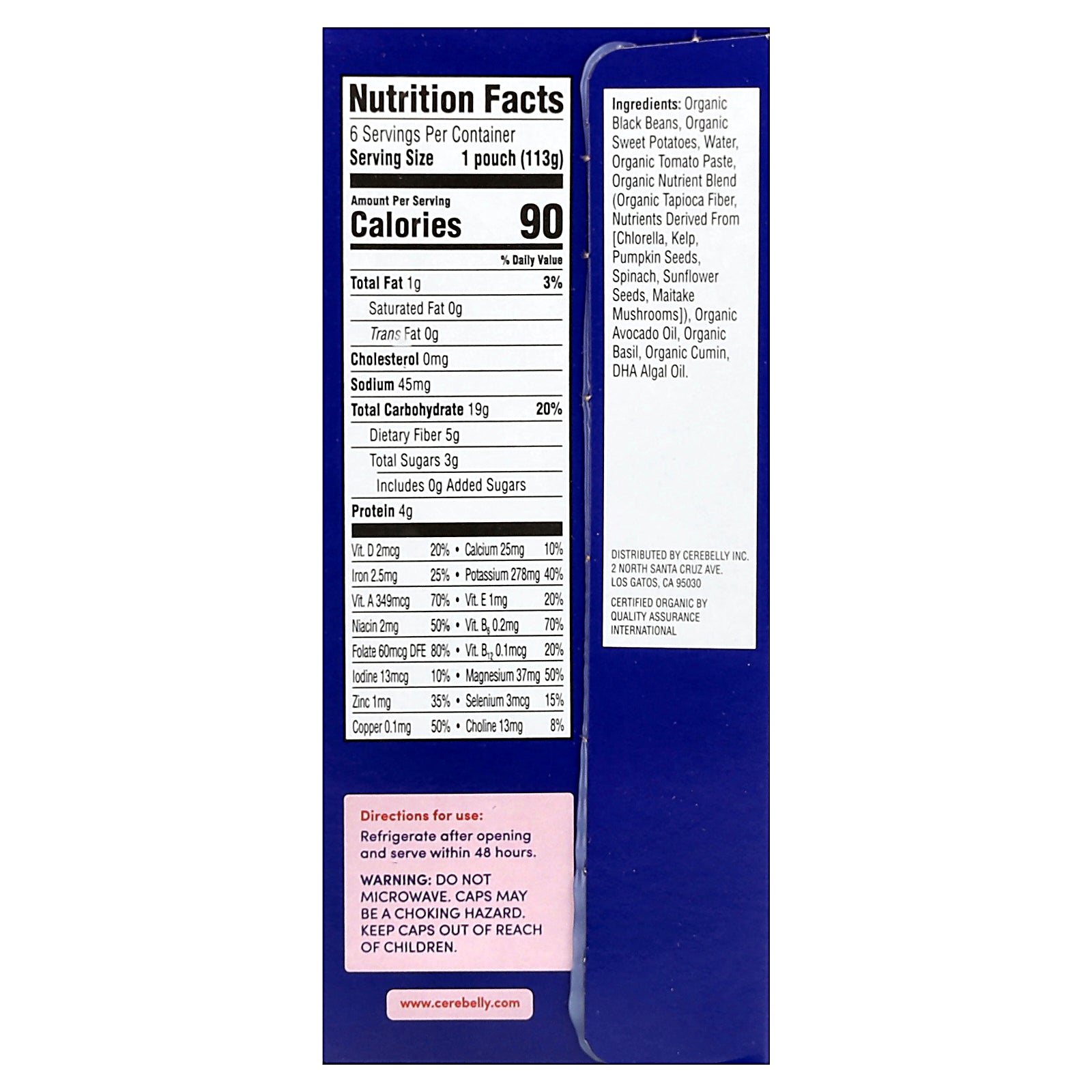 Organic black beans, organic sweet potatoes, water, organic tomato paste, organic nutrient blend (organic tapioca fiber, nutrients derived from [chlorella, kelp, pumpkin seeds, spinach, sunflower seeds, maitake mushrooms]), organic avocado oil, organic basil, organic cumin, dha algal oil.