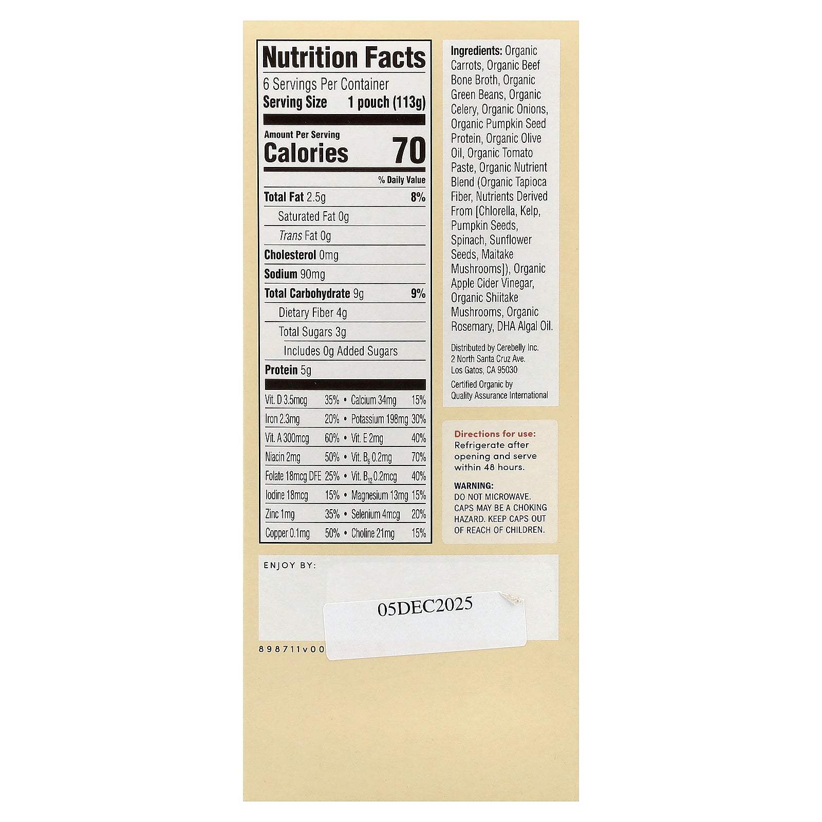 Organic carrots, organic beef bone broth, organic green beans, organic celery, organic onions, organic pumpkin seed protein, organic olive oil, organic tomato paste, organic nutrient blend (organic tapioca fiber, nutrients derived from [chlorella, kelp, pumpkin seeds, spinach, sunflower seeds, maitake mushrooms]), organic apple cider vinegar, organic shiitake mushrooms, organic rosemary, dha algal oil.