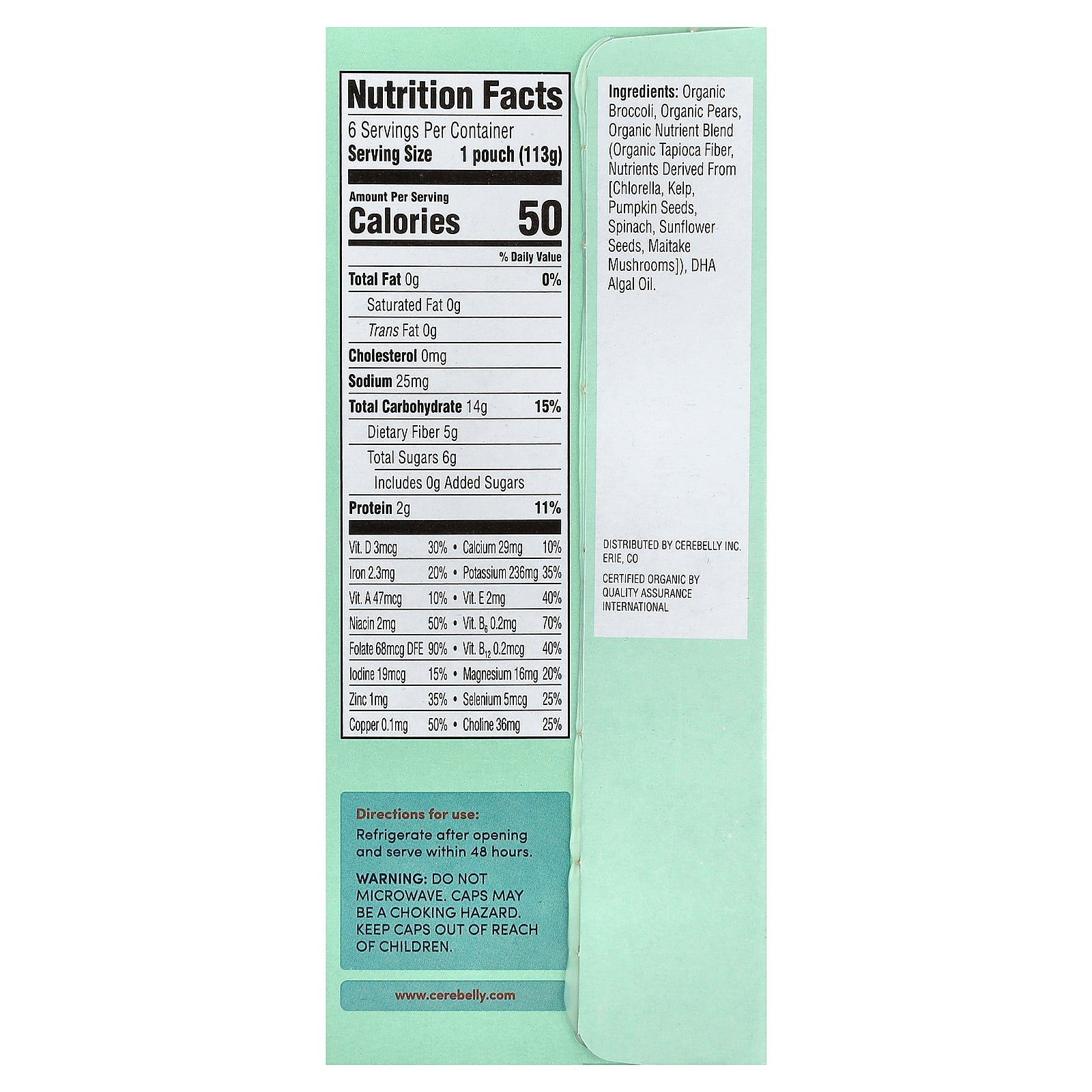 Organic broccoli, organic pears, organic nutrient blend (organic tapioca fiber, nutrients derived from [chlorella, kelp, pumpkin seeds, spinach, sunflower seeds, maitake mushrooms]), dha algal oil.