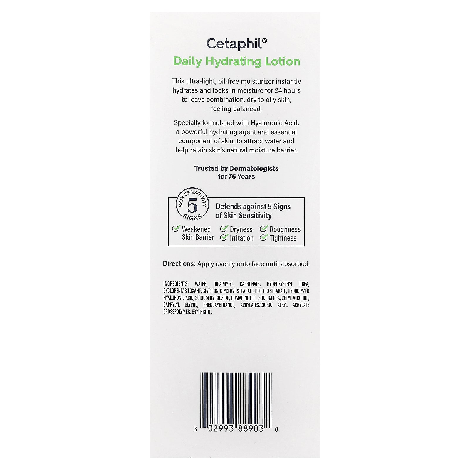 Formulated with Hyaluronic Acid and clinically-proven gentle on sensitive skin, this oil-free facial lotion hydrates for 24 hours and protects skin from dryness without clogging pores.