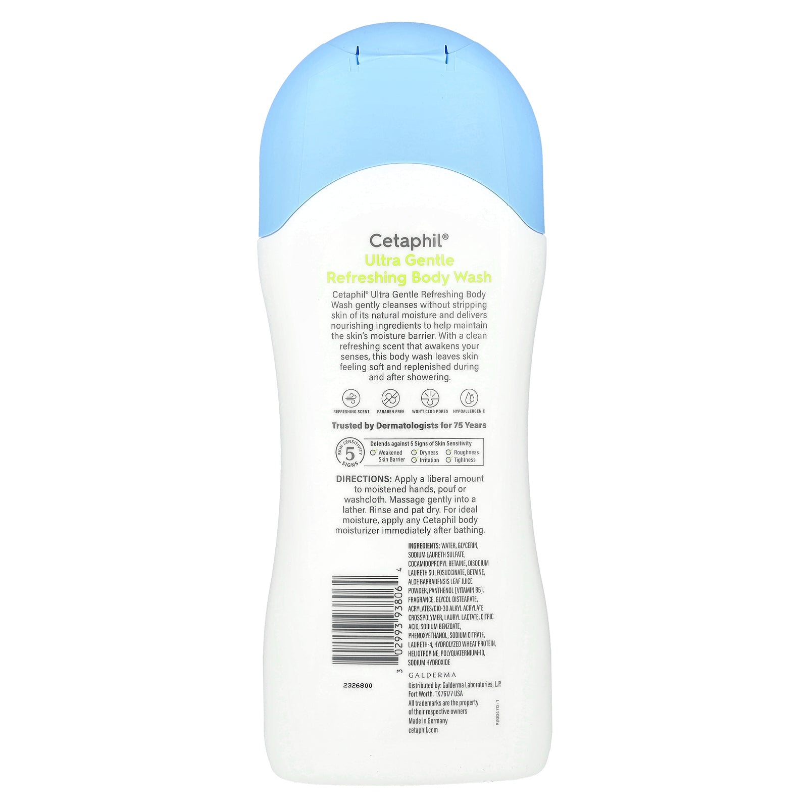 Cetaphil® Ultra Gentle Refreshing Body Wash gently cleanses without stripping skin of its natural moisture and delivers nourishing ingredients to help maintain the skin's moisture barrier. With a clean refreshing scent that awakens your senses, this body wash leaves skin feeling soft and replenished during and after showering.