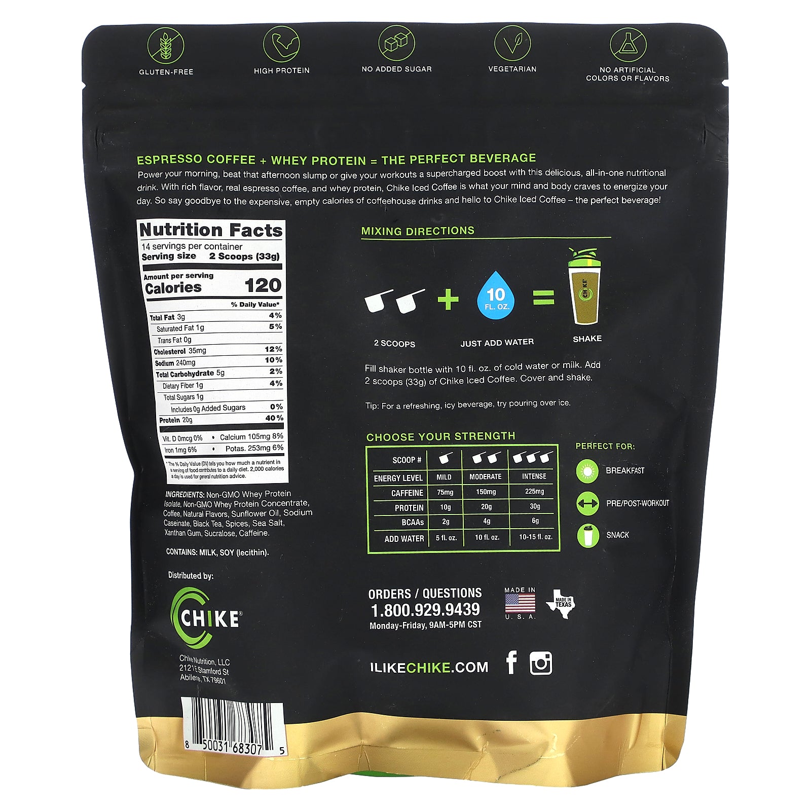 Power your morning, beat that afternoon slump or give your workouts a supercharged boost with this delicious, all-in-one nutritional drink. With rich flavor, real espresso coffee, and whey protein, Chike Iced Coffee is what your mind and body craves to energize your day. So say goodbye to the expensive, empty calories of coffeehouse drinks and hello to Chike Iced Coffee - the perfect beverage!