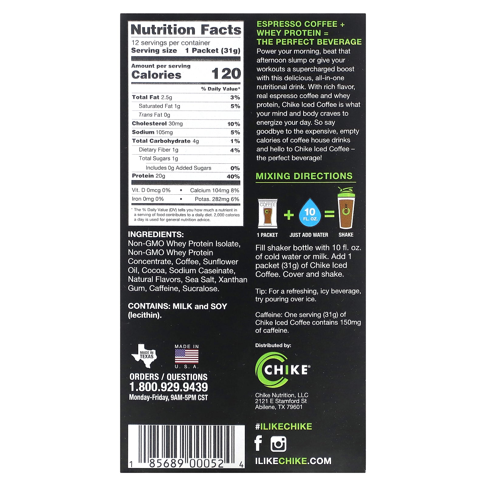 Power your morning, beat that afternoon slump or give your workouts a supercharged boost with this delicious, all-in-one nutritional drink. With rich flavor, real espresso coffee, and whey protein, Chike Iced Coffee is what your mind and body craves to energize your day. So say goodbye to the expensive, empty calories of coffeehouse drinks and hello to Chike Iced Coffee - the perfect beverage!