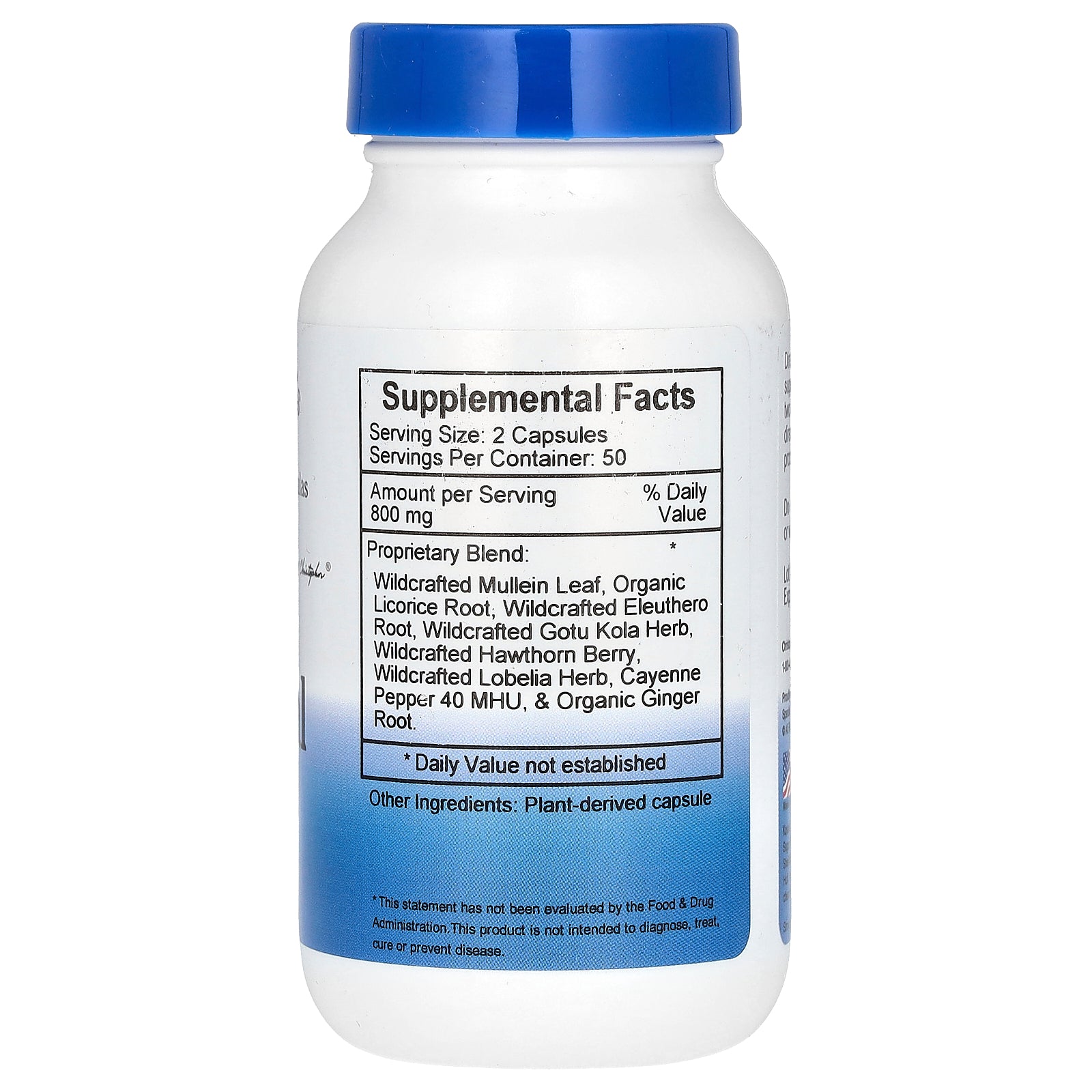 | Proprietary Blend: Wildcrafted Mullein Leaf, Organic Licorice Root, Wildcrafted Eleuthero Root, Gotu Kola Herb, Organic Hawthorn Berry, Organic Lobelia Herb, Cayenne Pepper (40 MHU), & Organic Ginger Root. |