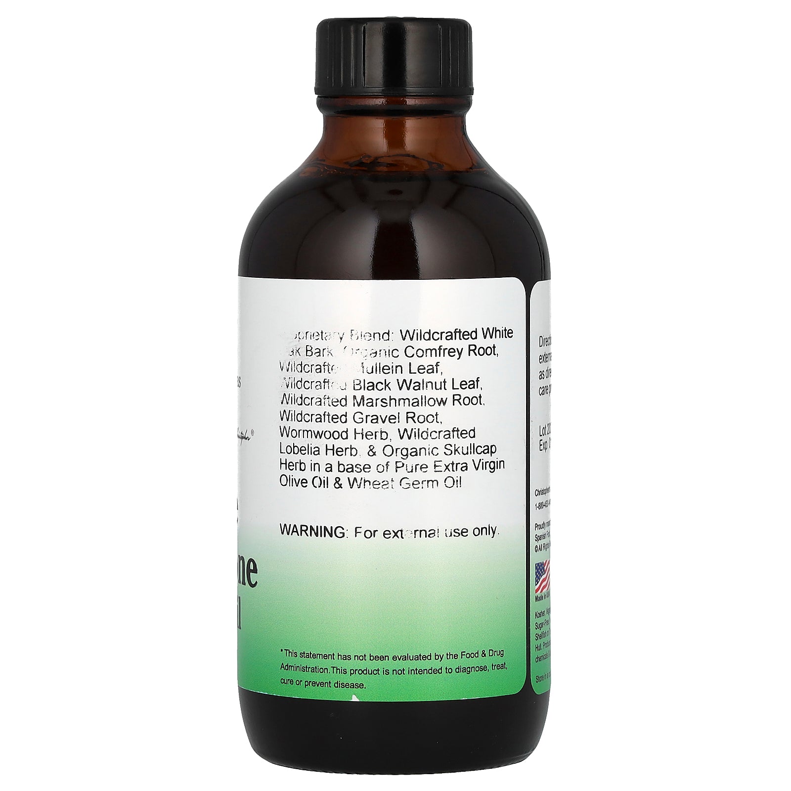 Wildcrafted white oak bark, organic comfrey root, wildcrafted mullein leaf, wildcrafted black walnut leaf, wildcrafted marshmallow root, wildcrafted gravel root, wormwood herb, wildcrafted lobelia herb, & organic skullcap herb in a base of pure extra virgin olive oil & wheat germ oil.