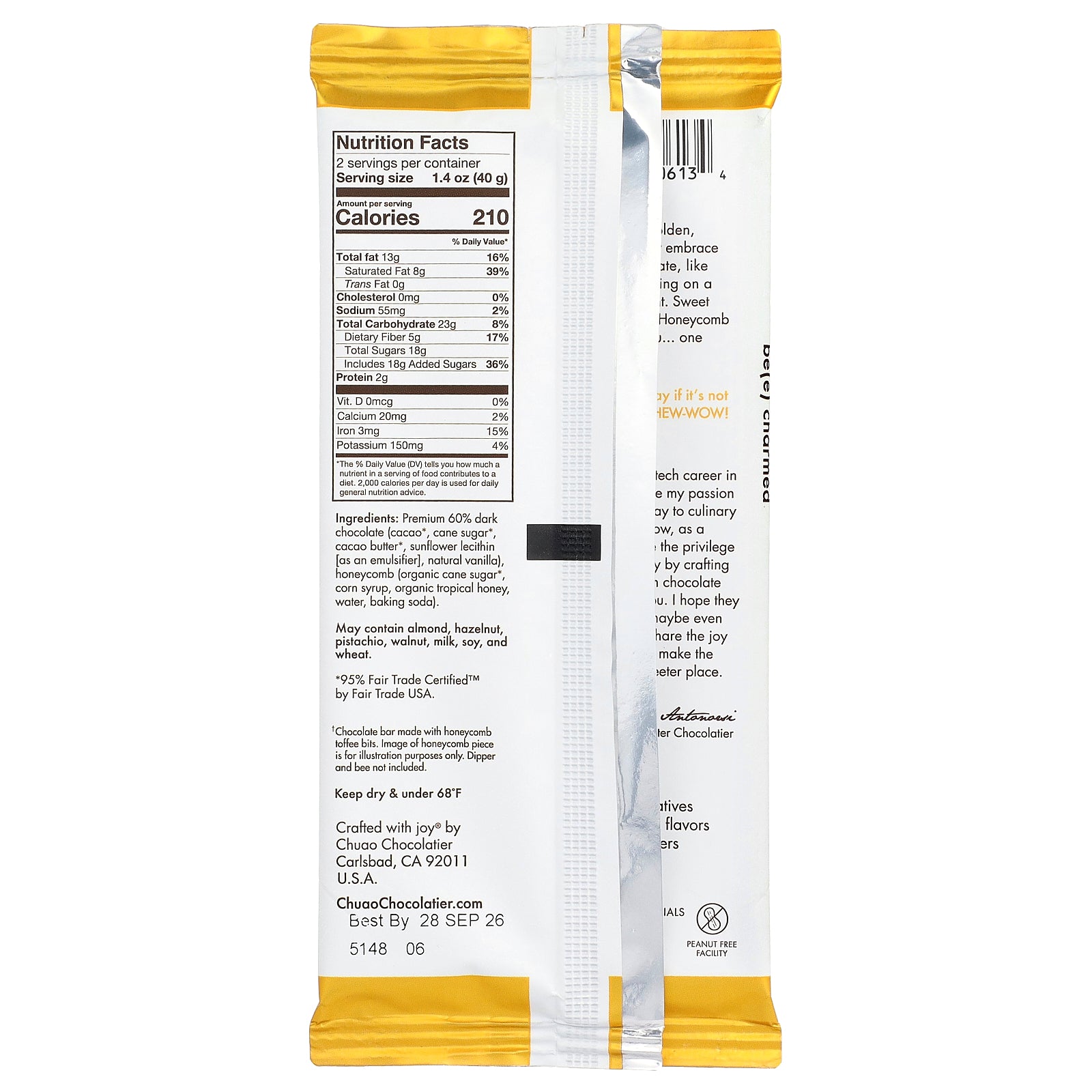 Premium 60% dark chocolate (cacao*, cane sugar*, cacao butter*, sunflower lecithin [as an emulsifier], natural vanilla), honeycomb (organic cane sugar*, corn syrup, organic tropical honey, water, baking soda).