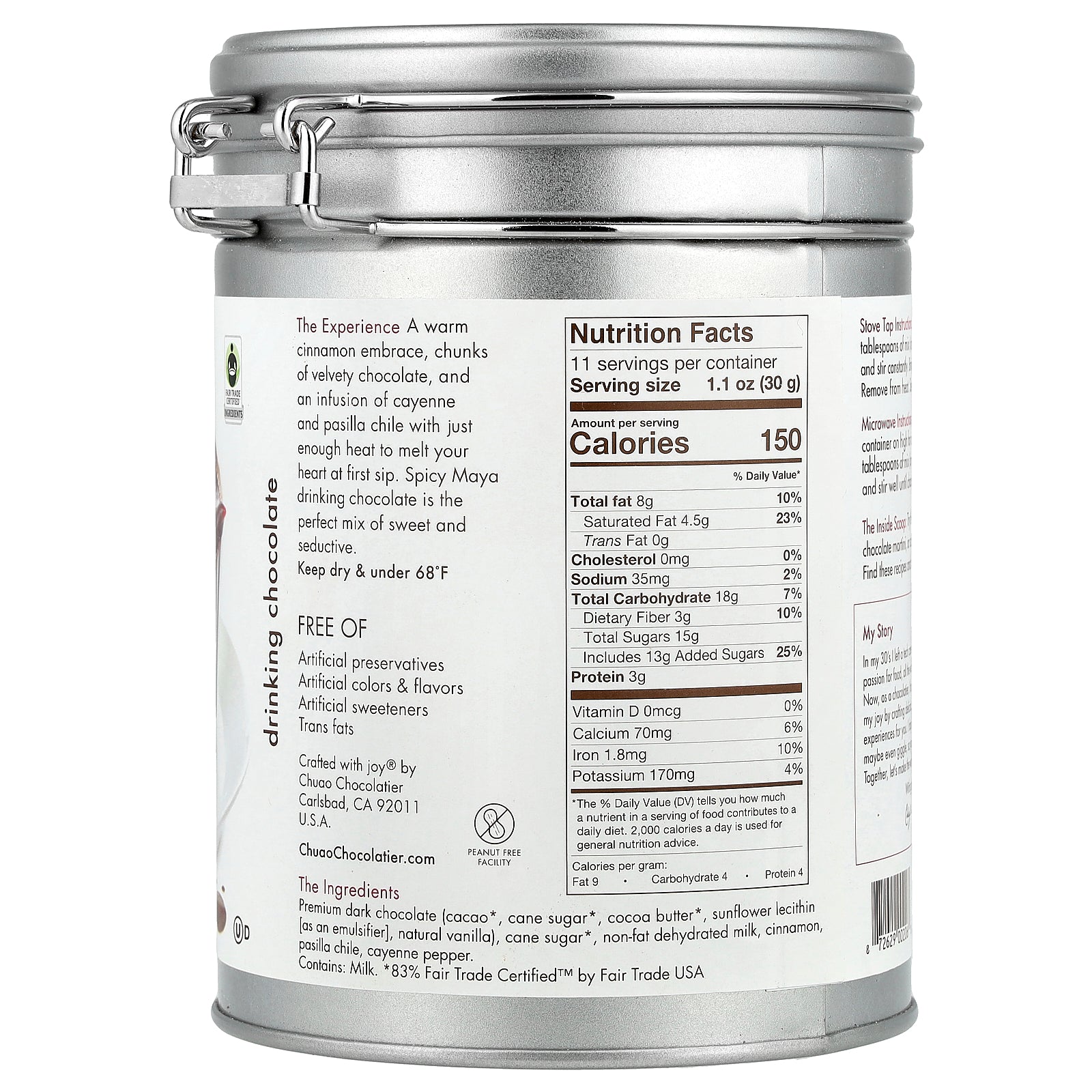 Premium dark chocolate (cacao*, cane sugar*, cocoa butter*, sunflower lecithin [as an emulsifier], natural vanilla), cane sugar*, non-fat dehydrated milk, cinnamon pasilla chile, cayenne pepper.