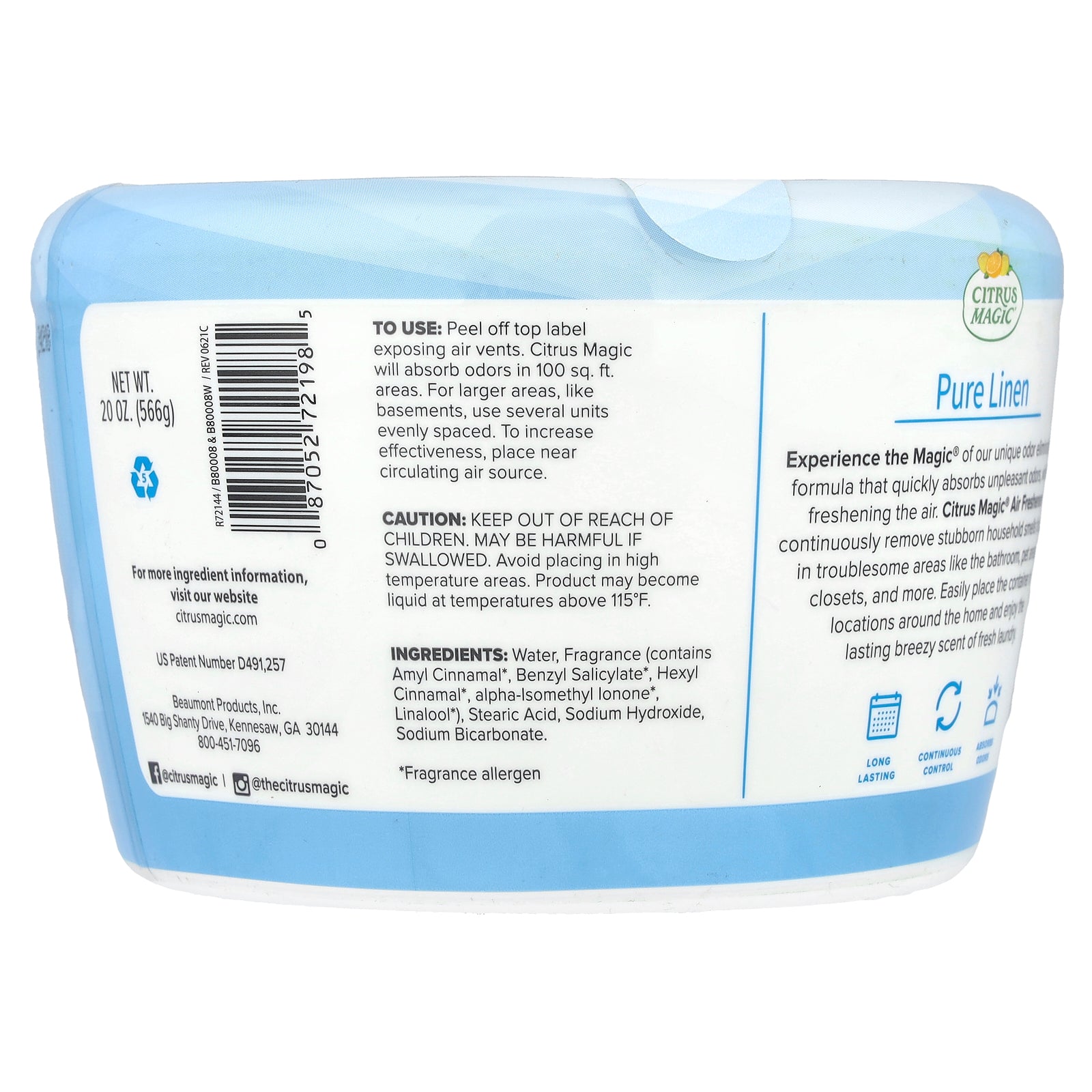 Experience the Magic® of our unique odor eliminating formula that quickly absorbs unpleasant odors, while freshening the air. Citrus Magic® Air Fresheners continuously remove stubborn household smells found in troublesome areas like the bathroom, pet areas, closets, and more. Easily place the container in locations around the home and enjoy the lasting breezy scent of fresh laundry.