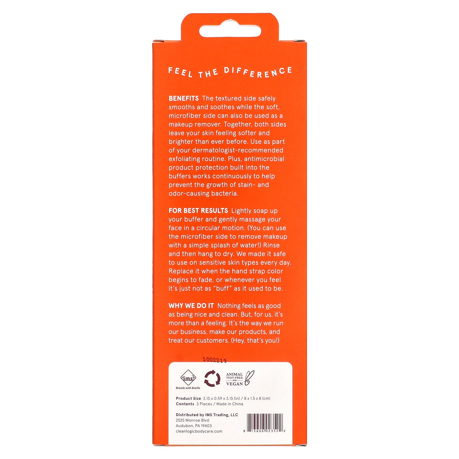 Benefits The textured side safely smooths and soothes while the soft, microfiber side can also be used as a makeup remover. Together, both sides leave your skin feeling softer and brighter than ever before. Use as part of your dermatologist-recommended exfoliating routine. Plus, antimicrobial product protection built into the buffers works continuously to help prevent the growth of stain- and odor-causing bacteria.