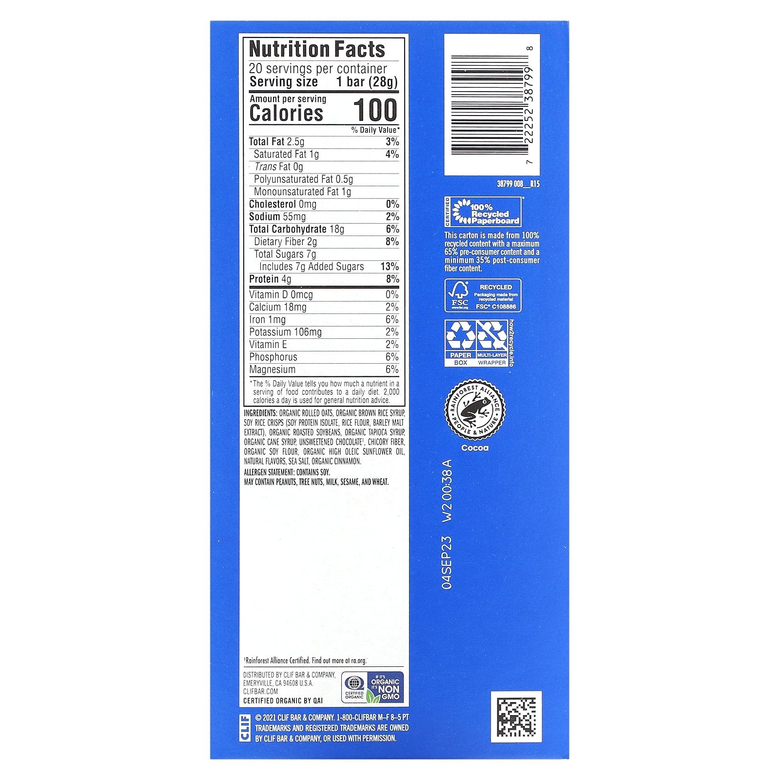 Organic rolled oats, organic brown rice syrup, soy rice crisps (soy protein isolate, rice flour, barley malt extract), organic roasted soybeans, organic tapioca syrup, organic cane syrup, unsweetened chocolate', chicory fiber, organic soy flour, organic high oleic sunflower oil, natural flavors, sea salt, organic cinnamon.