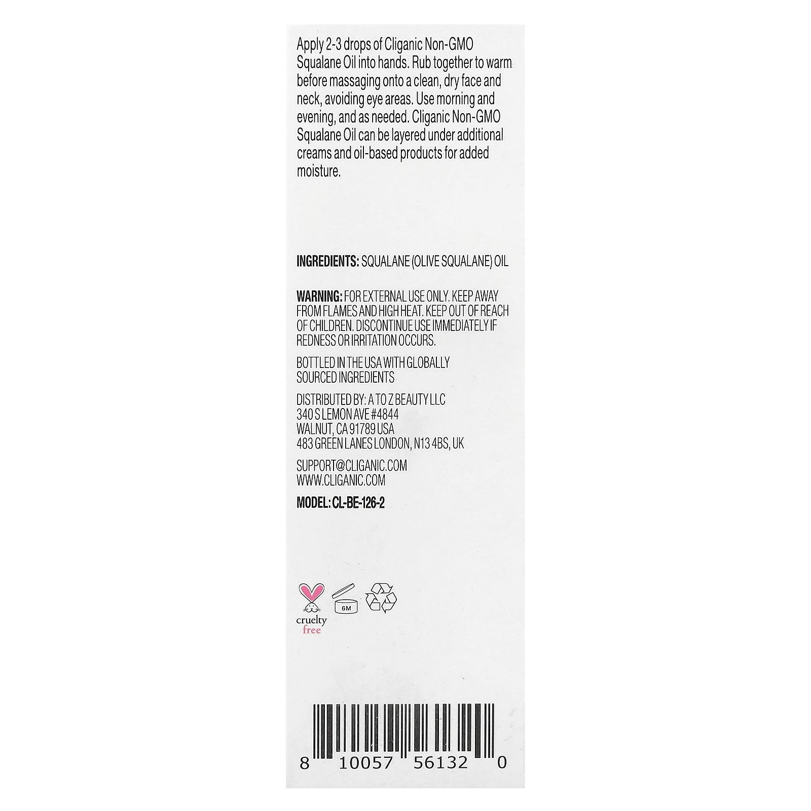 Apply 2-3 drops of Cliganic Non-GMO Squalane Oil into hands. Rub together to warm before massaging onto a clean, dry face and neck, avoiding eye areas. Use morning and evening, and as needed. Cliganic Non-GMO Squalane Oil can be layered under additional creams and oil-based products for added moisture.