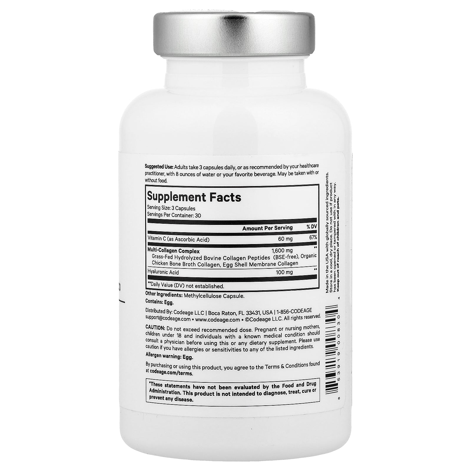 Multi-Collagen Complex Grass-Fed Hydrolyzed Bovine Collagen Peptides (BSE-free), Organic Chicken Bone Broth Collagen, Egg Shell Membrane Collagen. |