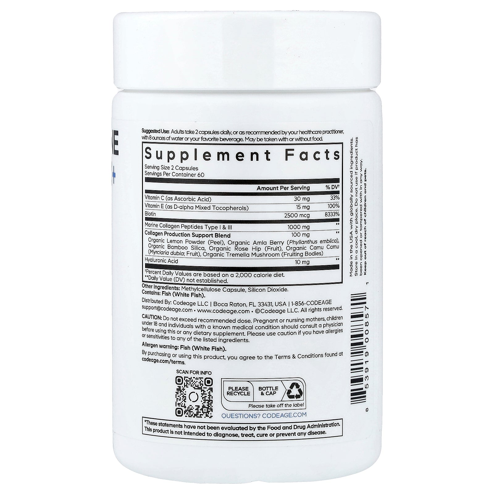 - Codeage Wild Caught Biotin Marine Collagen contains marine collagen of type 1 & 3 and biotin, a water-soluble B-vitamin.