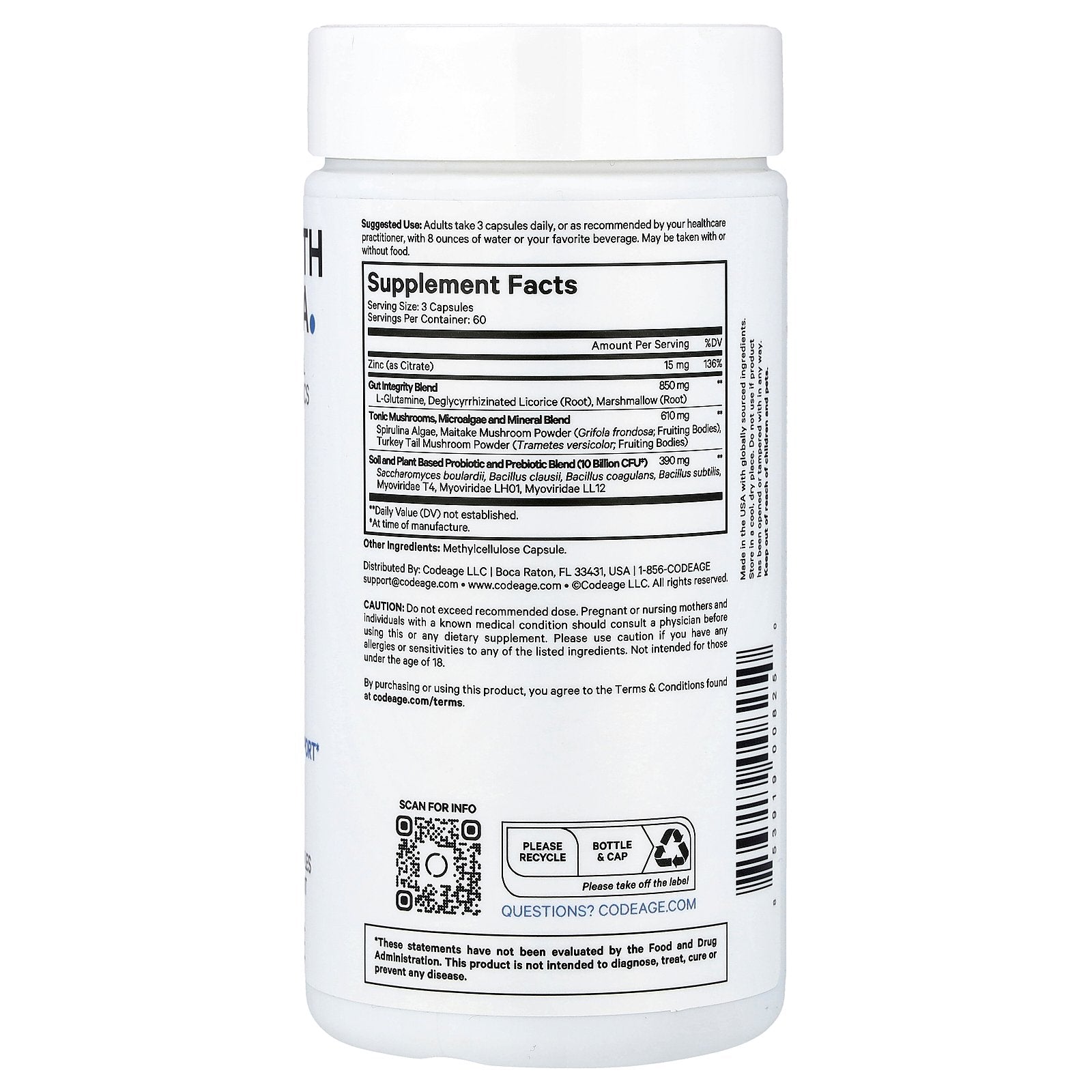 Codeage Gut Health Formula is a comprehensive supplement that combines L-glutamine, probiotics, prebiotics, deglycyrrhizinated licorice, marshmallow root, adaptogenic herbs, microalgae, tonic mushrooms, and zinc.
