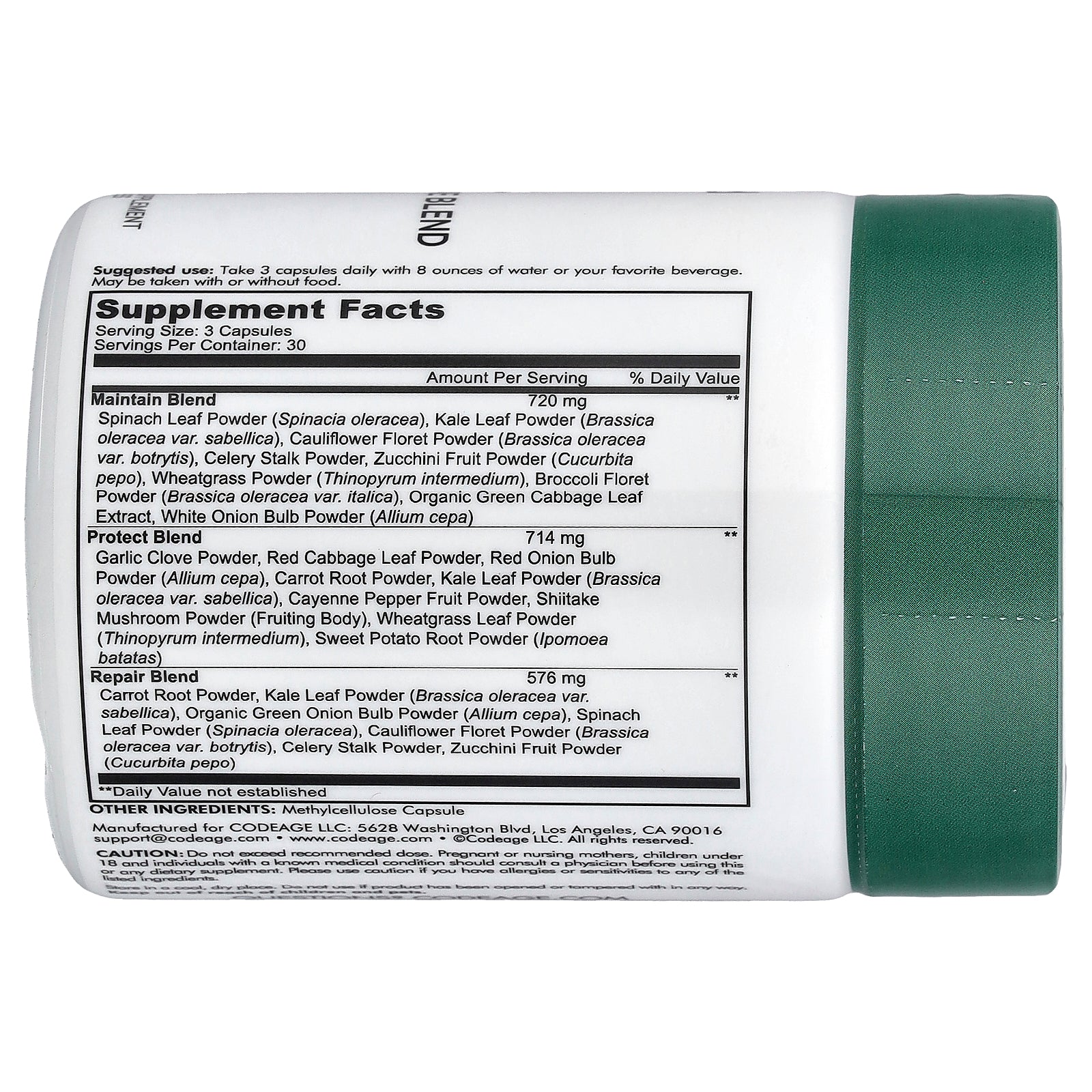Maintain Blend Spinach Leaf Powder (Spinacia oleracea), Kale Leaf Powder (Brassica oleracea var. sabellica), Cauliflower Floret Powder (Brassica oleracea var. botrytis), Celery Stalk Powder, Zucchini Fruit Powder (Cucurbita pepo), Wheatgrass Powder (Thinopyrum intermedium), Broccoli Floret Powder (Brassica oleracea var. italica), Organic Green Cabbage Leaf Extract, White Onion Bulb Powder (Allium cepa). |