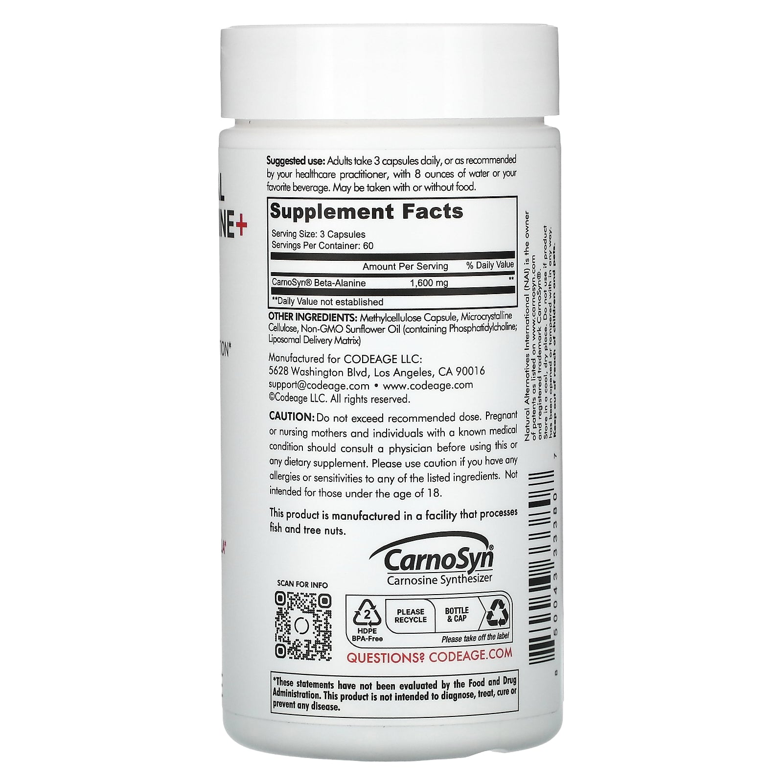 Codeage Liposomal Beta-Alanine+ is a premium supplement for athletes and fitness enthusiasts. Formulated with CarnoSyn® Beta-Alanine and featuring a liposomal delivery to help enhance absorption, this beta-alanine supplement is designed to help support endurance, muscle, and overall athletic performance.