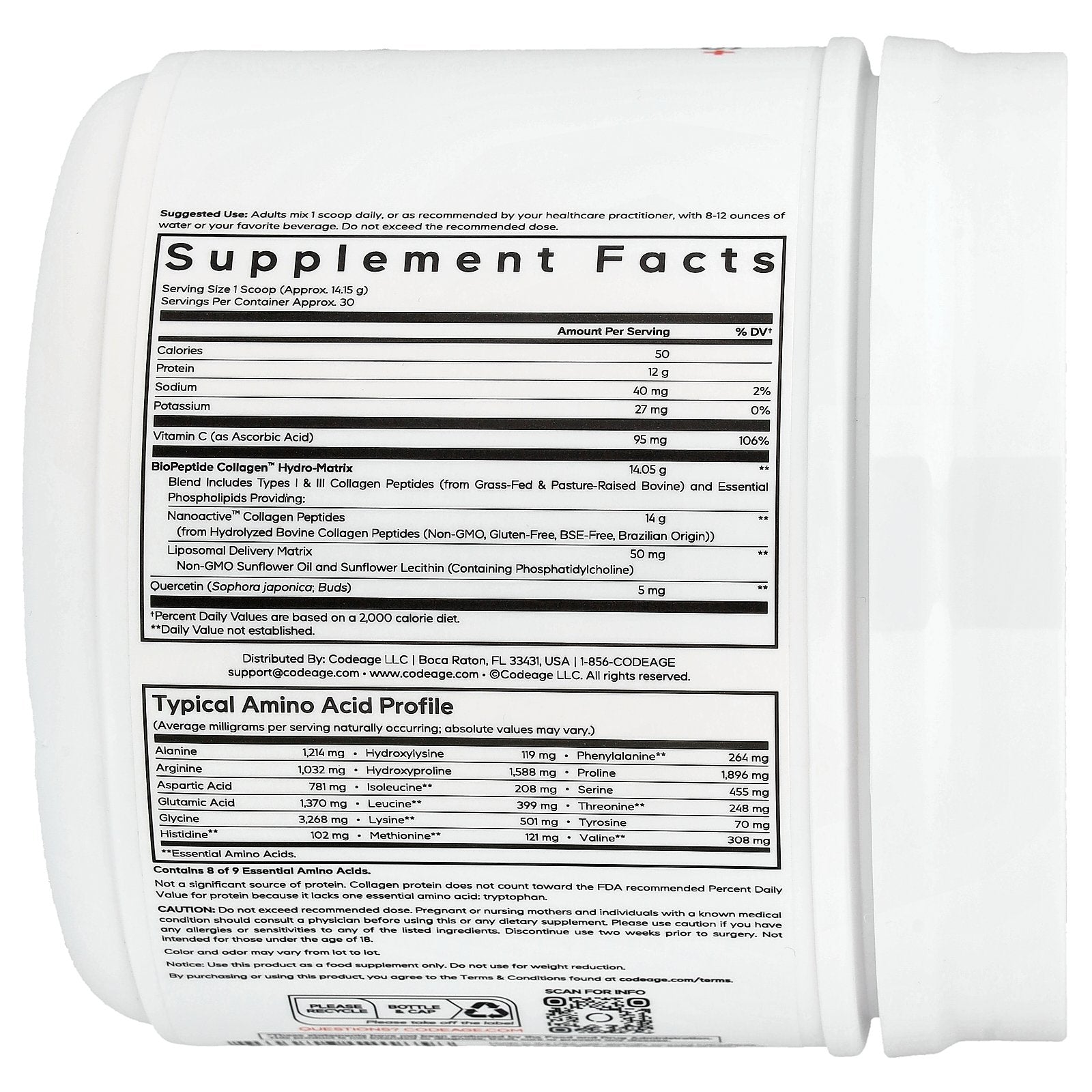 Codeage Liposomal Collagen Peptides+ is a comprehensive collagen supplement offering a blend of hydrolyzed collagen, vitamin C enriched with quercetin, and phospholipids. This product provides 18 amino acids in an unflavored powder form.