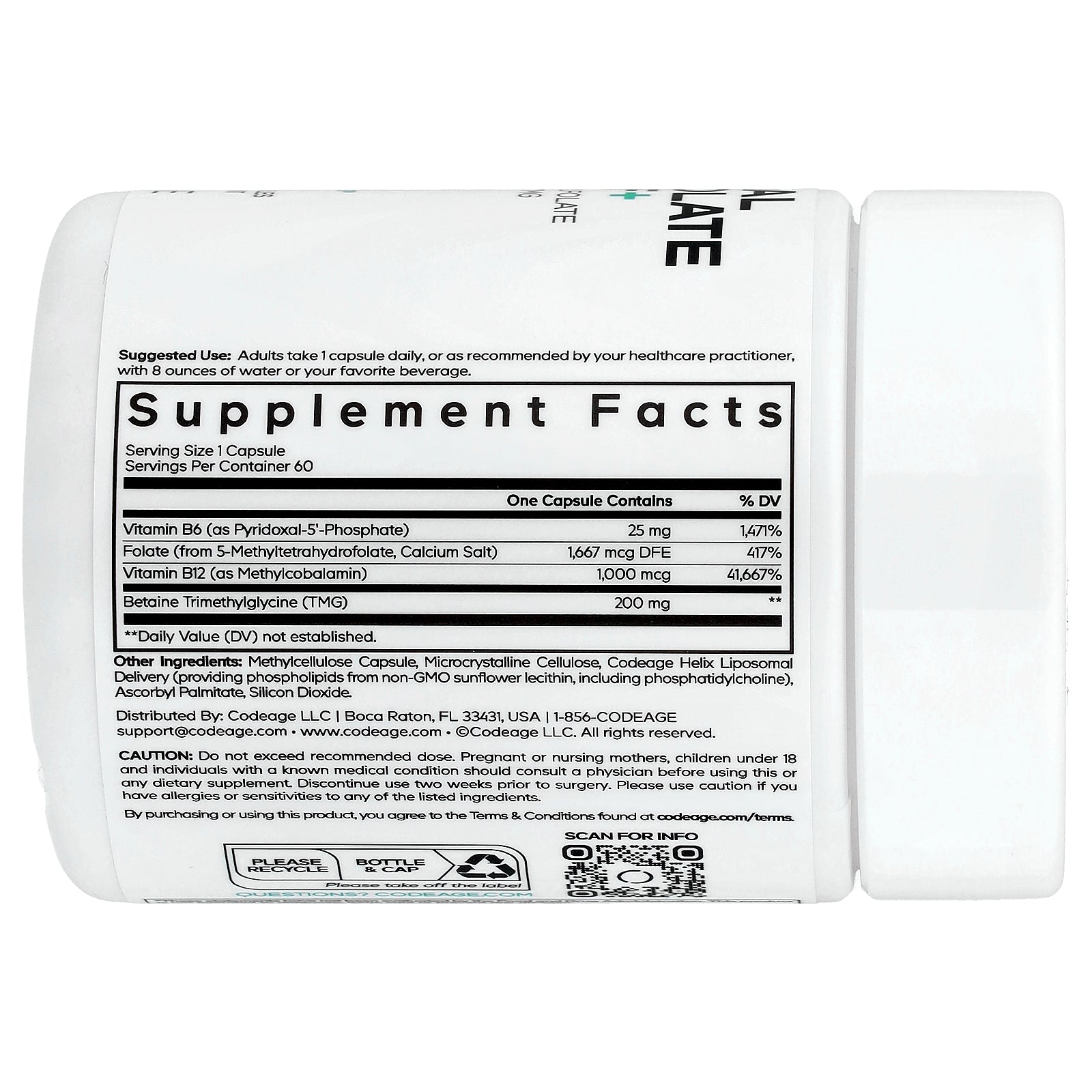Codeage Liposomal L-Methylfolate 5-MTHF+ supplement provides L-Methylfolate (Vitamin B9) and Methylcobalamin (B12) in their active form, as well as Pyridoxal 5’-Phosphate (B6), enhanced with TMG and Codeage proprietary Helix liposomal delivery.