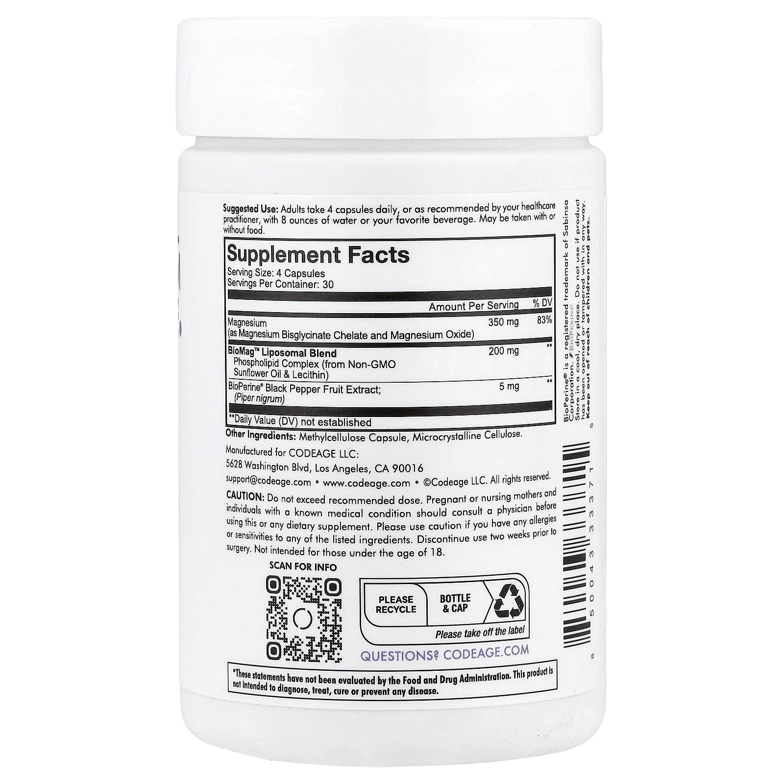 Codeage Liposomal Magnesium Glycinate supplement formula provides 350 mg of magnesium bisglycinate chelate per serving.