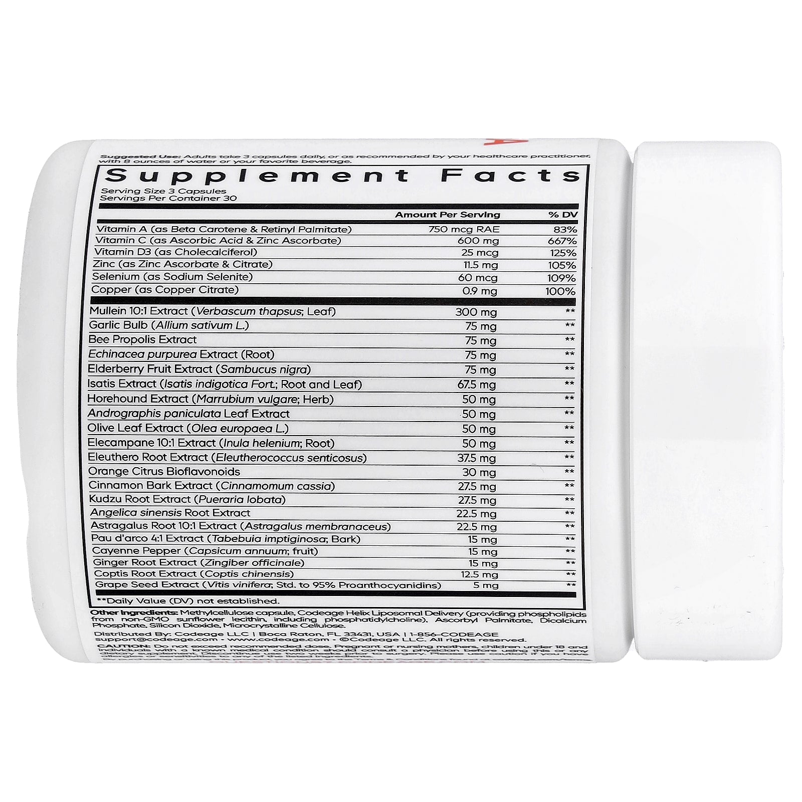 Methylcellulose capsule, codeage helix liposomal delivery (providing phospholipids from non-gmo sunflower lecithin, including phosphatidylcholine), ascorbyl palmitate, dicalcium phosphate, silicon dioxide, microcrystalline cellulose.