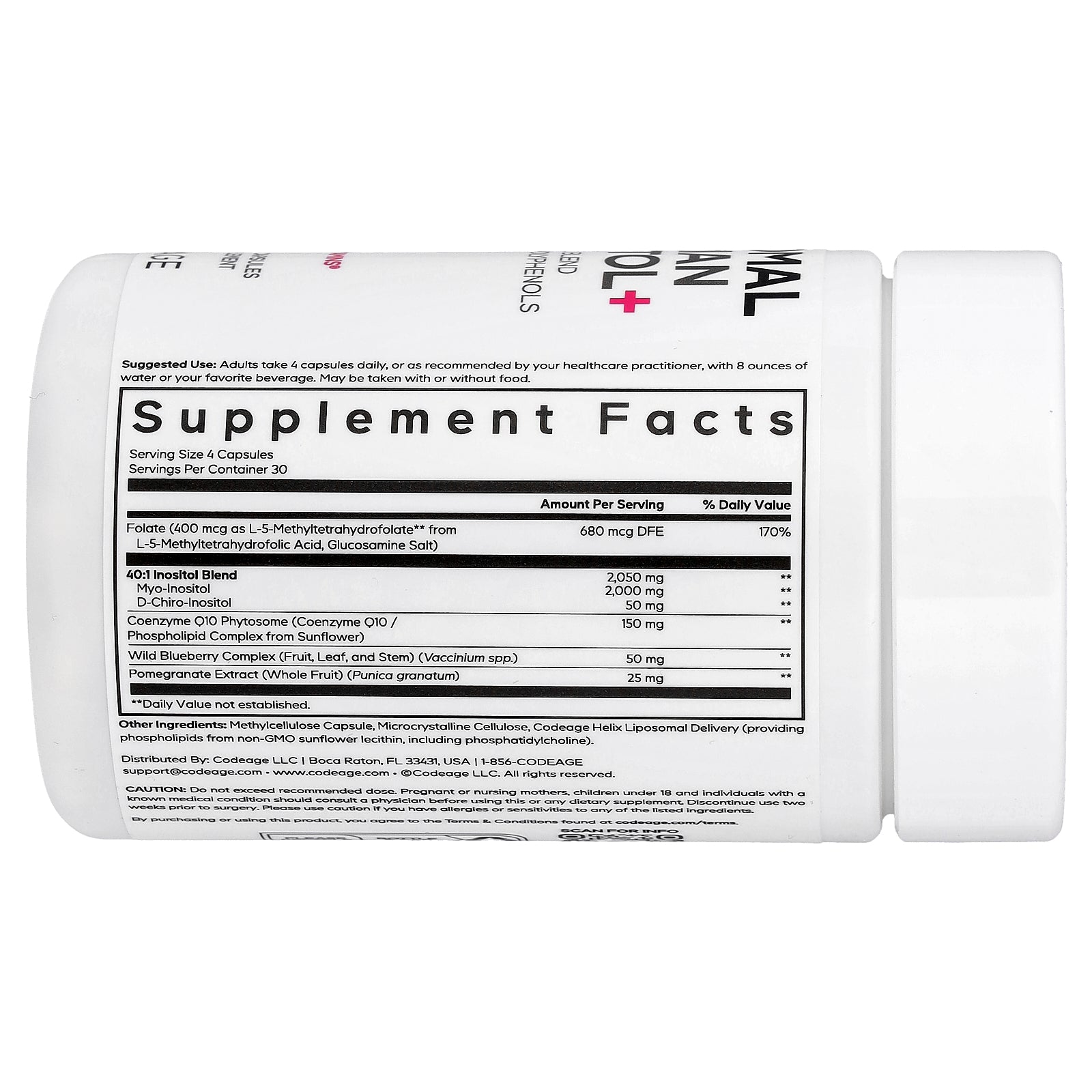 Codeage Liposomal Ovarian Inositol+ is a dietary supplement designed for women. It features a blend of Myo-Inositol, D-chiro-inositol, 5-MTHF folate, CoQ10, and extracts of Wild Blueberry and Pomegranate. This supplement uses a liposomal delivery.