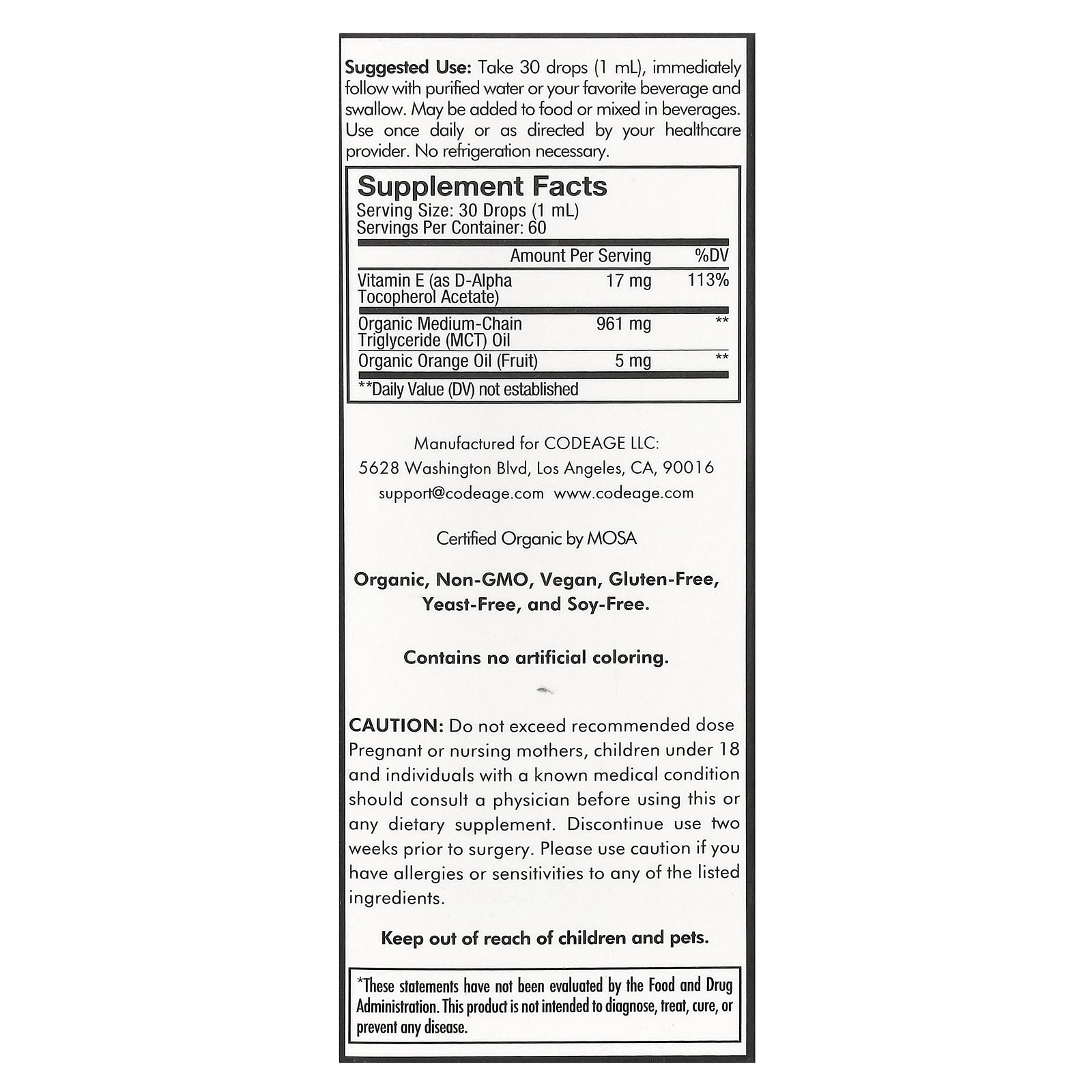 Codeage Liposomal Vitamin E+ offers a premium blend of Vitamin E, organic MCT Oil, and organic orange oil fruit to provide antioxidants and help support your skin and immune system in a convenient and unflavored liquid format.
