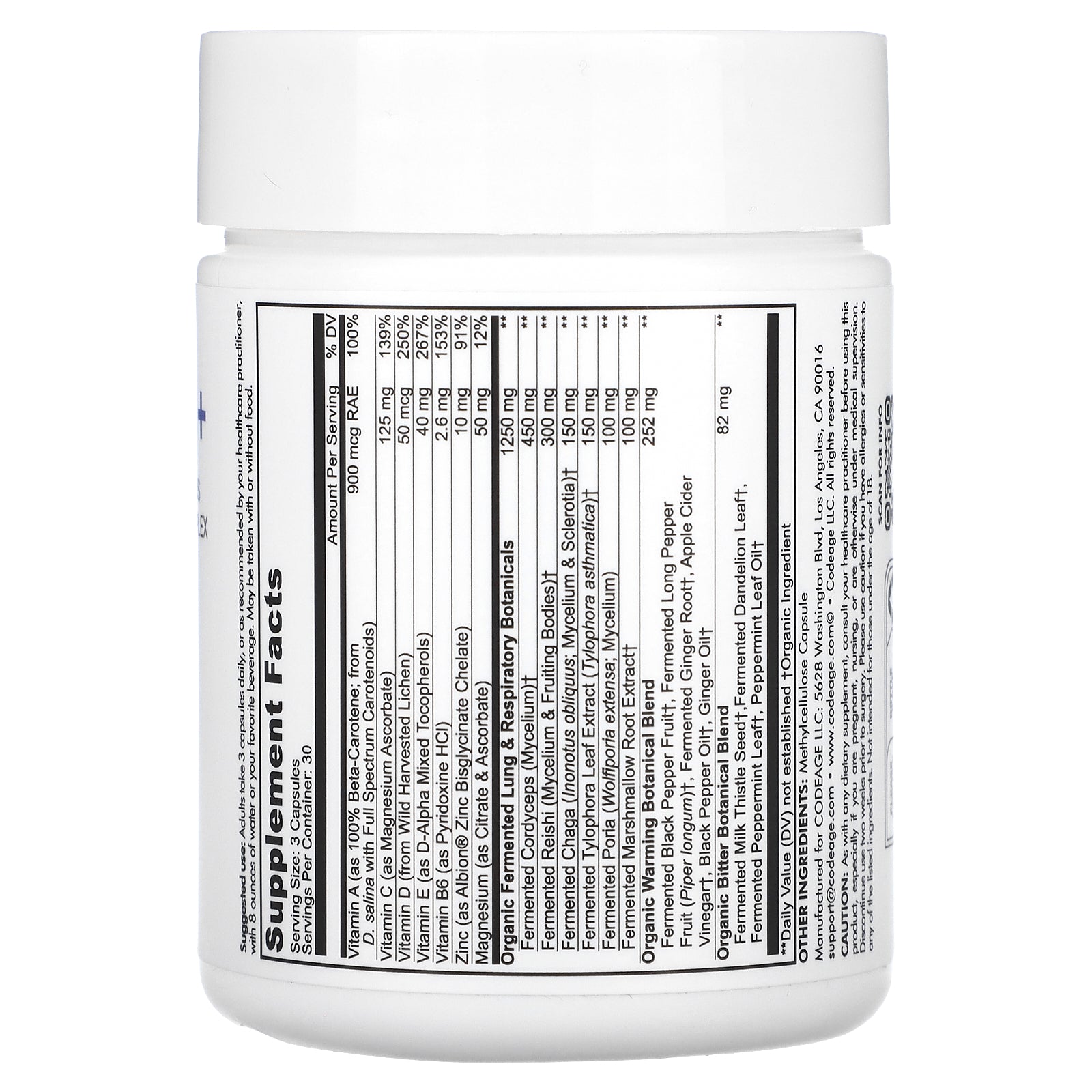 Codeage Lungs Vitamins+ offers a unique blend of vitamins, minerals, bitter botanicals, and fermented ingredients, including vitamins A, C, D, & E, magnesium, zinc, and organic mushrooms designed to help support the immune system, lungs, and respiratory health.