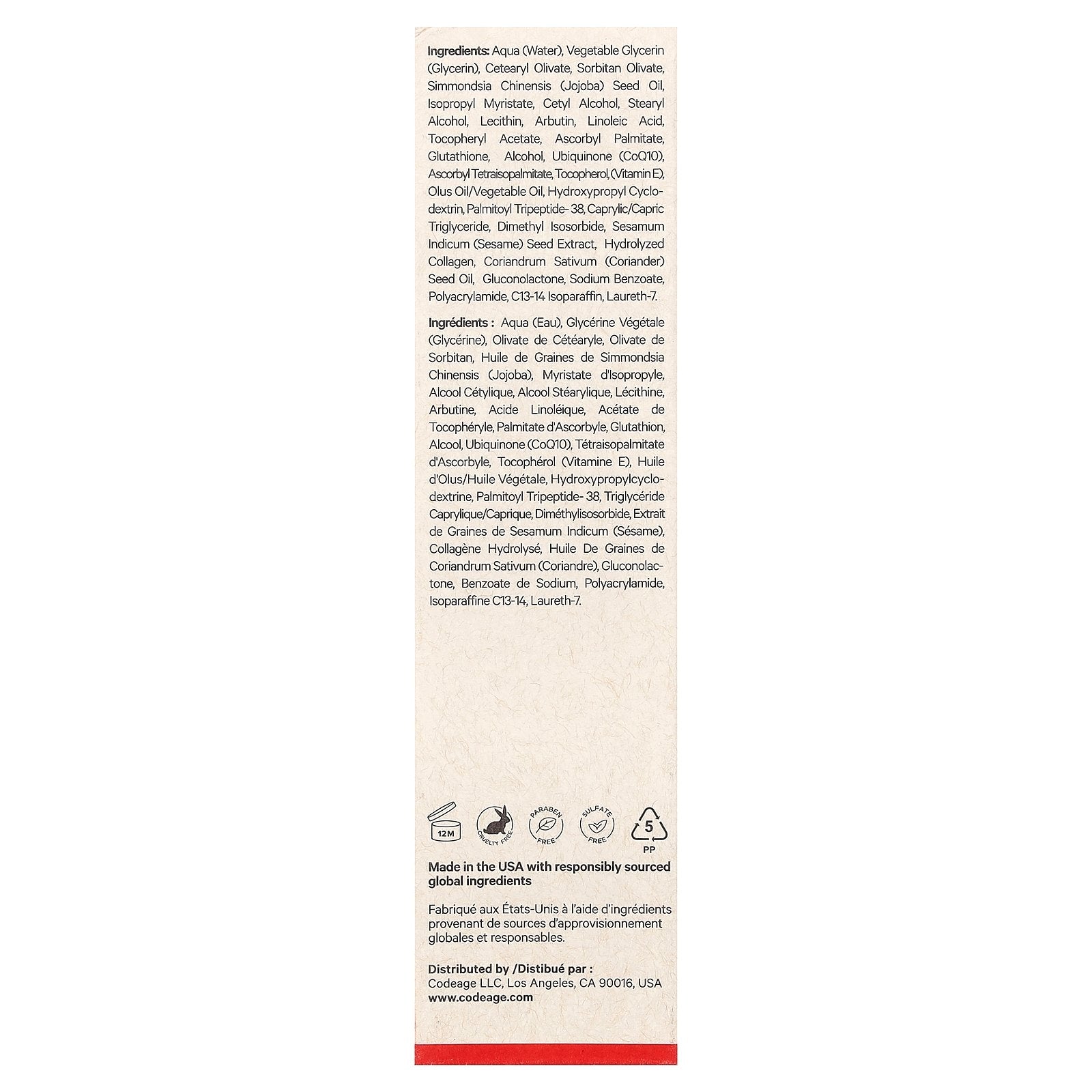 Aqua (water), vegetable glycerin (glycerin), cetearyl olivate, sorbitan olivate, simmondsia chinensis (jojoba) seed oil, isopropyl myristate, cetyl alcohol, stearyl alcohol, lecithin, arbutin, linoleic acid, tocopheryl acetate, ascorbyl palmitate, glutathione, alcohol, ubiquinone (coq10), ascorbyl tetraisopalmitate, tocopherol, (vitamin e), olus oil/vegetable oil, hydroxypropyl cyclodextrin, palmitoyl tripeptide- 38, caprylic/capric triglyceride, dimethyl isosorbide, sesamum indicum (sesame) seed extract, hydrolyzed collagen, coriandrum sativum (coriander) seed oil, gluconolactone, sodium benzoate, polyacrylamide, c13-14 isoparaffin, laureth-7.