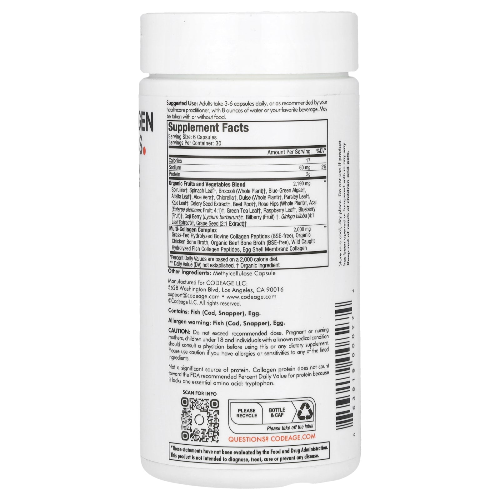 Codeage Multi Collagen Raw Greens supplement in capsules offers 5 collagen types from 5 diverse food sources. This formula is amplified with 21 organic raw greens, fruits, and veggies, including spirulina, broccoli, beetroot, aloe vera, kale leaf, celery seed, spinach leaf, and grape seed extracts. Delivering 18 amino acids, this collagen supplement also incorporates antioxidants like blueberry, raspberry leaf, goji berry, ginkgo biloba, and green tea leaf for a multifaceted approach to well-being.